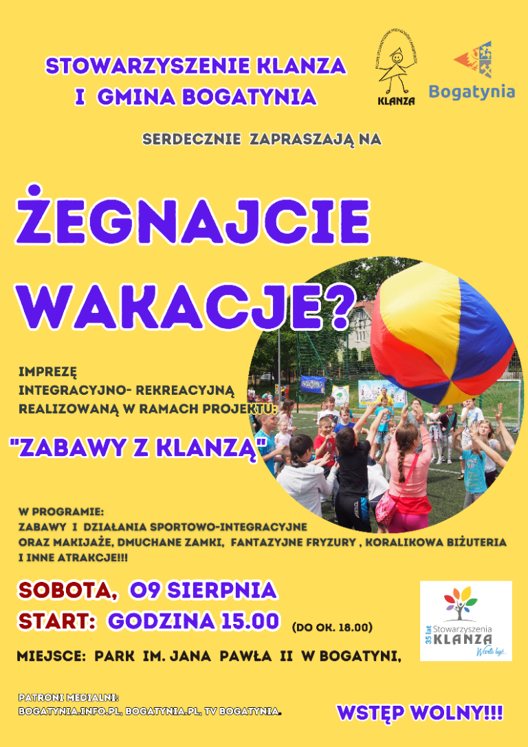 Stowarzyszenie KLANZA serdecznie zaprasza na „ŻEGNAJCIE WAKACJE?” czyli kolejne, a zarazem ostatnie plenerowe działania realizowane w ramach projektu „ZABAWY Z KLANZĄ”.