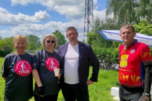 Kolejny punkt kontrolny znajdował się w samym centrum rynku, gdzie można było uzupełnić płyny. Po krótkim odpoczynku udaliśmy się na dalsze etapy rajdu. Następny punkt żywieniowy był na styku trzech granic, gdzie przywitała nas grupa z Czech. Rzeka Nysa w tym miejscu stanowi granicę między trzema państwami europejskimi Polską, Czechami i Niemcami. Tutaj mogliśmy spróbować smacznych pierniczków z tradycyjnej niemieckiej piekarni. Po chwili wytchnienia i posiłku udaliśmy się na bardziej wymagający odcinek trasy, który zaprowadził nas na polską stronę do miejscowości Kopaczów. Wiele osób, które widziały wcześniej kopalni, szczególnie obcokrajowcy, przystanęło na chwilę, aby zobaczyć z bliska ogrom odkrywki.