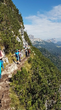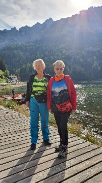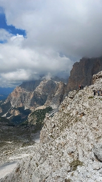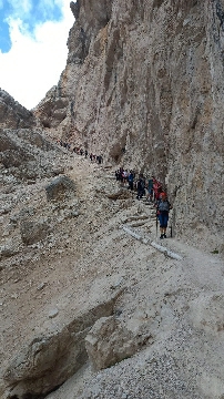 Następny dzień przywitał nas piękna słoneczną pogodą. Udaliśmy się na szlak by dotrzeć do jeziora Sorapis. Droga wiodła trawersem Orte de Marcuoira do schroniska Vandelli Rifugio A. Vandelli al Sorapis 1928 m n.p.m., nad którym wznosi się naturalna rzeźba – iglica Ditto di Dio – Palec Boga 2603 m n.p.m. oraz lodowce północnej flanki Sorapis. Piękny, malowniczy a jednocześnie niebezpiecznym szlak poprowadził nas do jeziora Sorapis. Idąc wzdłuż półki skalnej mogliśmy podziwiać inne pasma górskie. W wielu miejscach były trudności by przejść, ale dzięki stalowym linkom i podestom udawało nam się przejść przez niebezpieczne i techniczne trudne odcinki. Po wyczerpującej i ciężkiej trasie dotarliśmy nad jezioro Sorapis – Lago del Sorapis 1923 m n.p.m.