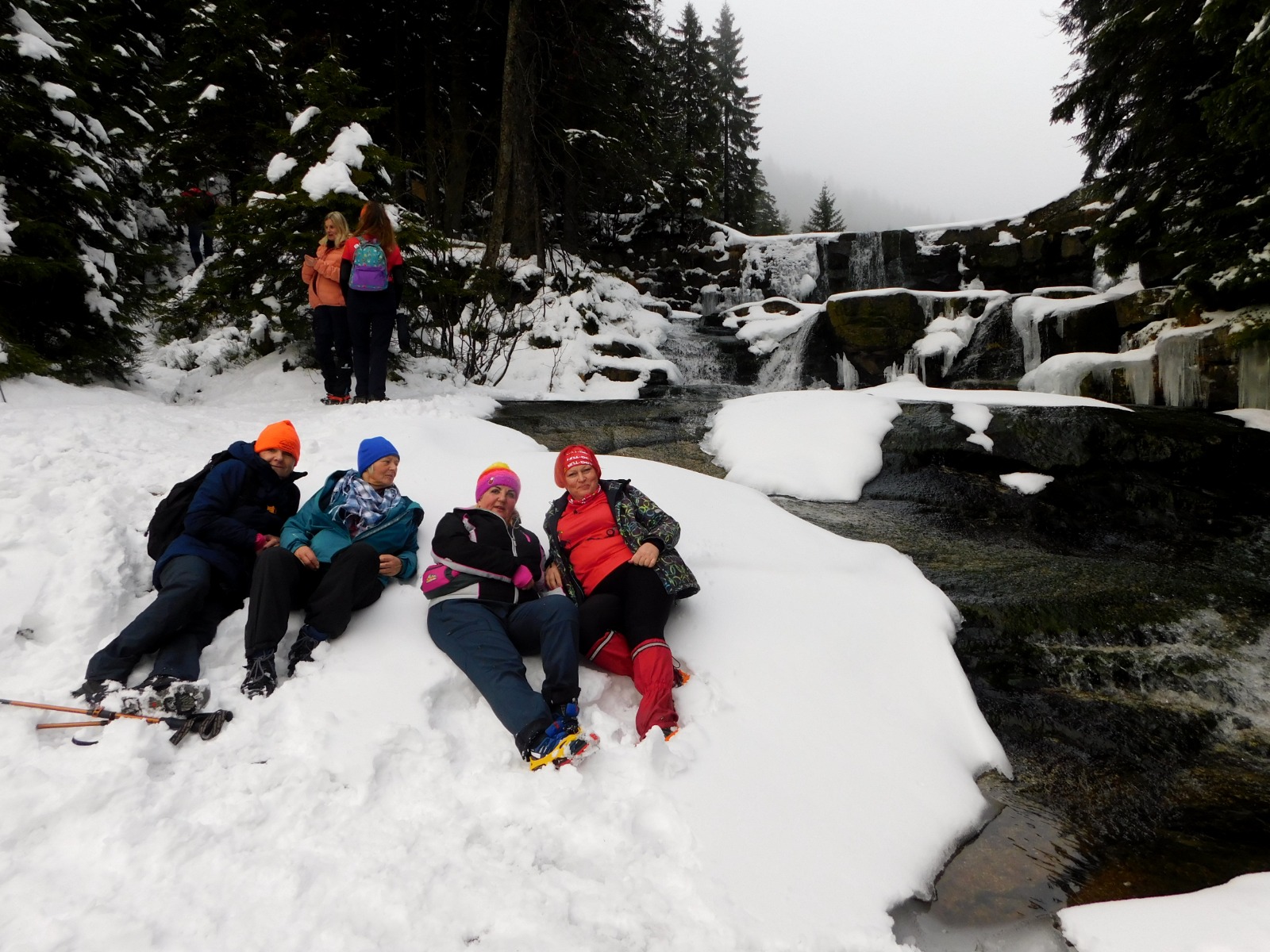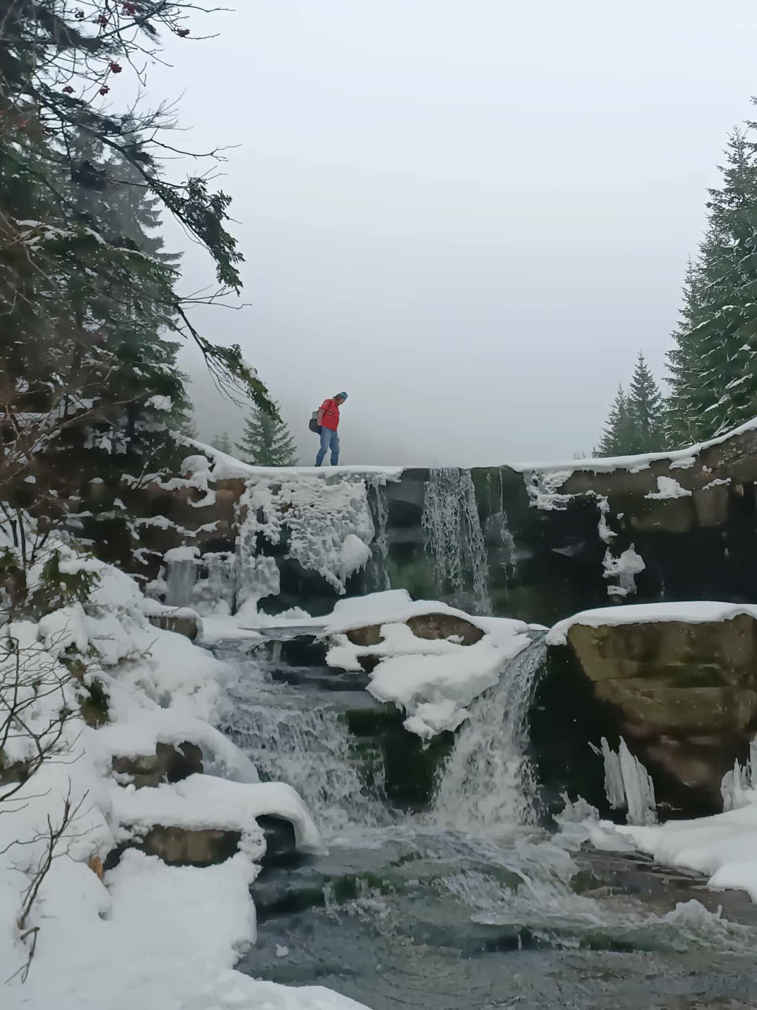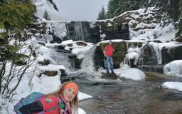 Najpierw dotarliśmy do schroniska „Odrodzenie”, gdzie zostawiliśmy cięższe plecaki i przygotowaliśmy się do pierwszej trasy. Po krótkim odpoczynku ruszyliśmy w stronę Wodospadów Białej Łaby. Zimowa aura sprawiła, że kaskady i potoki były częściowo skute lodem, tworząc przepiękne lodospady i malownicze formacje lodowe. Trasa prowadziła wzdłuż doliny, a zimowa szata Karkonoszy od razu wprowadziła nas w wyjątkowy klimat wyprawy.