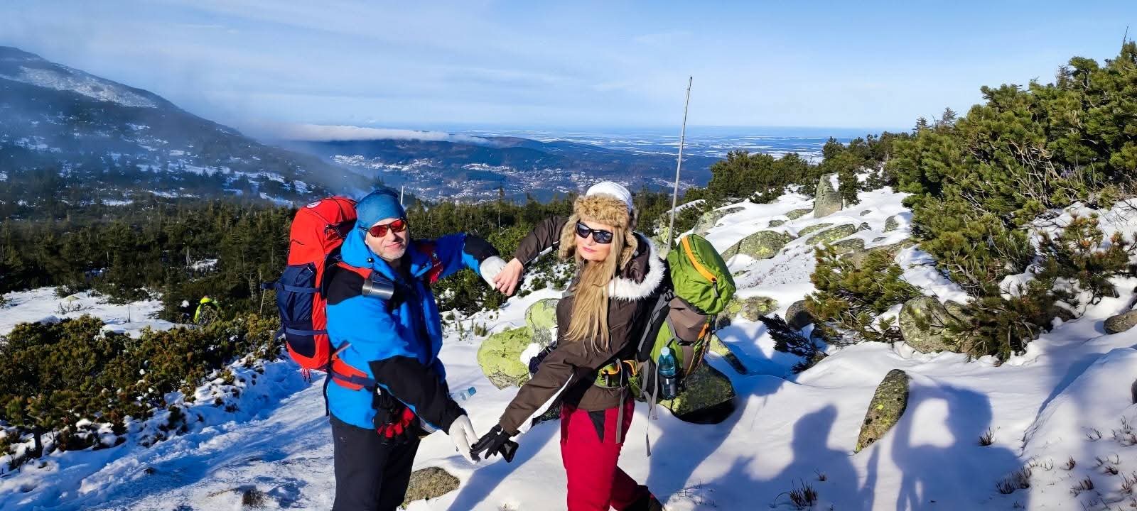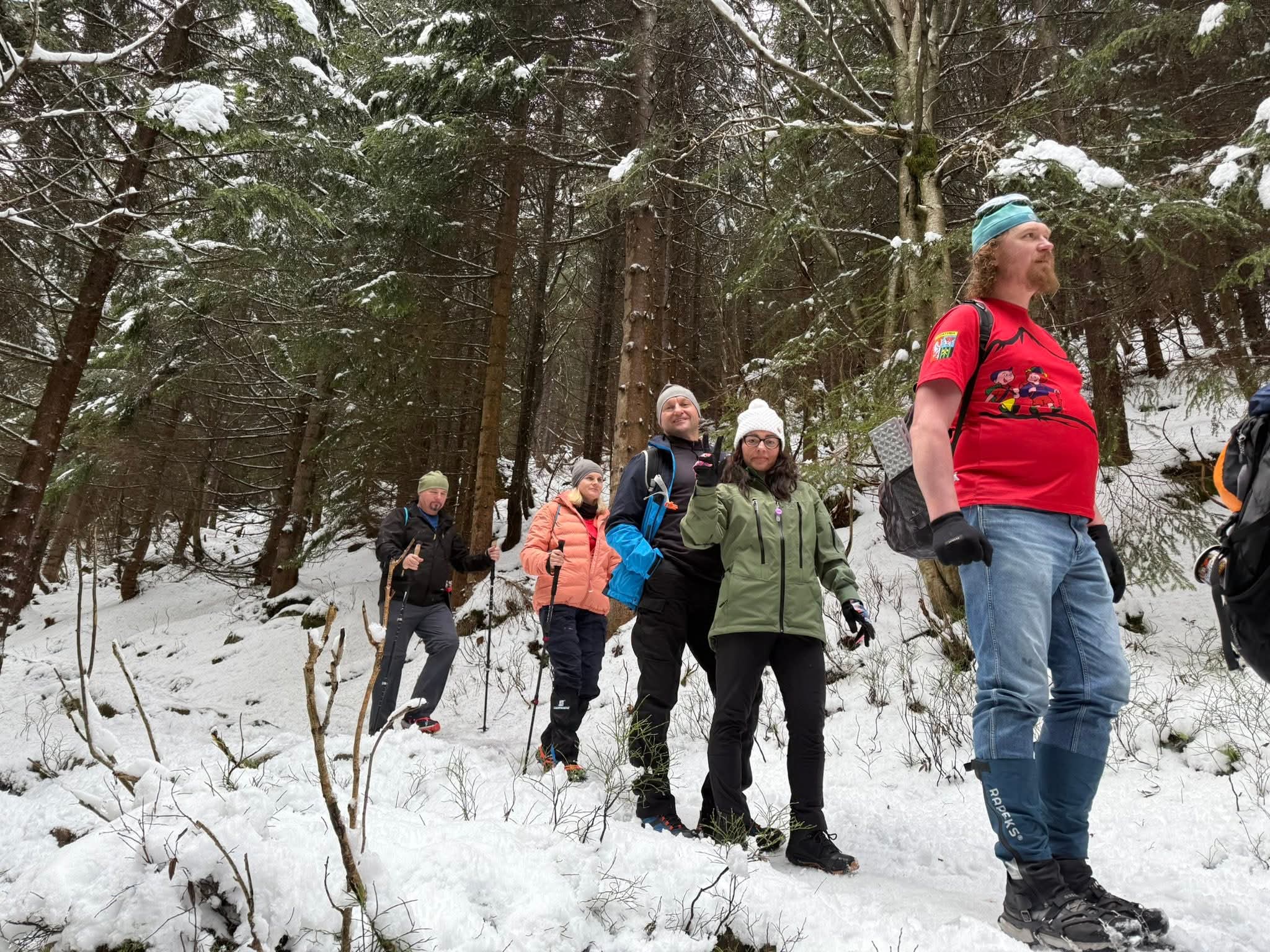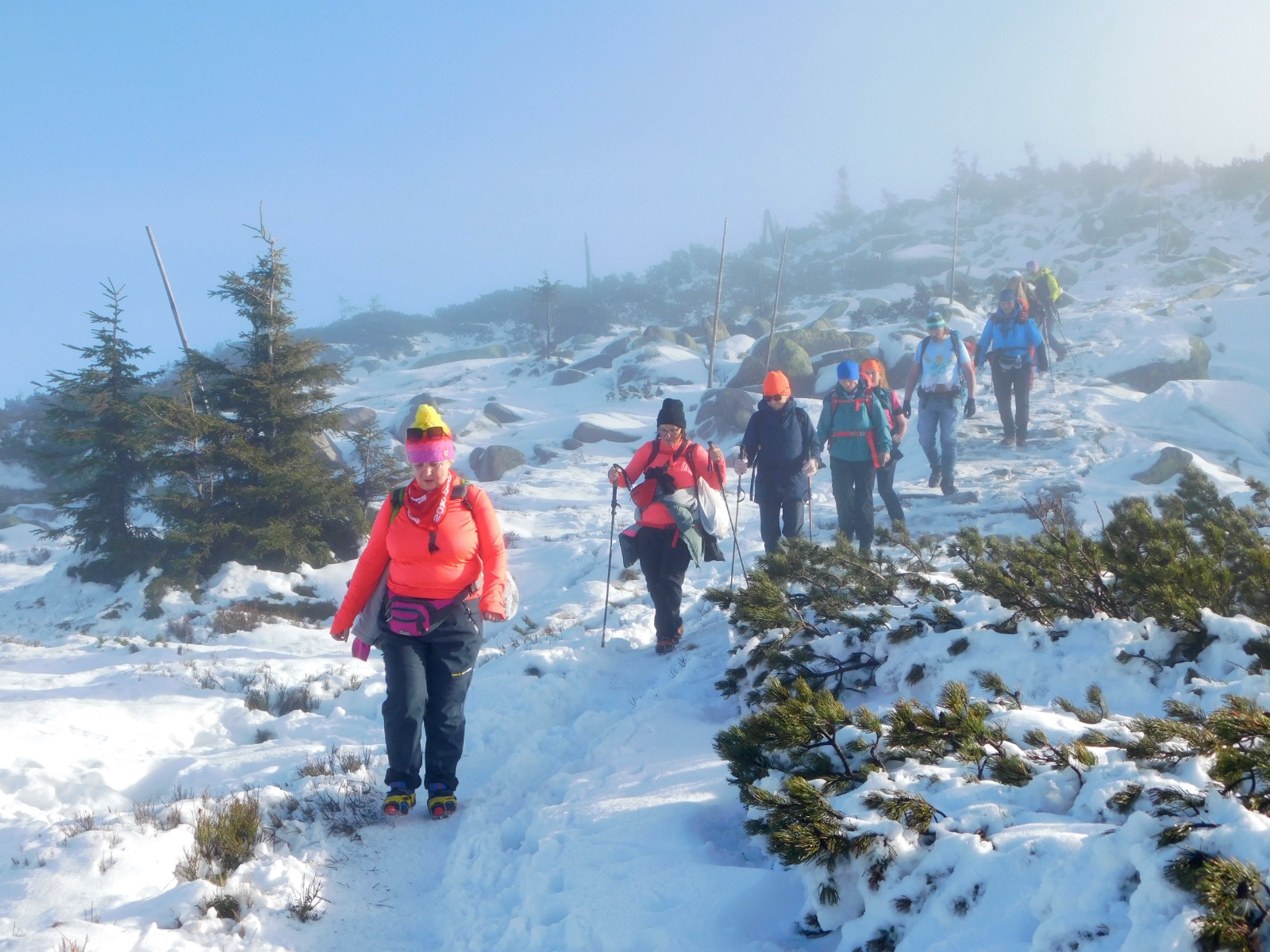 Niedzielny poranek powitał nas najpierw mgłą, a później piękną słoneczną pogodą i prawdziwie zimowym krajobrazem Karkonoszy. Po śniadaniu ruszyliśmy czerwonym szlakiem – Głównym Szlakiem Sudeckim, prowadzącym malowniczym grzbietem gór. Wspaniałe panoramy towarzyszyły nam przez całą drogę. Szczególne wrażenie zrobiły Śnieżne Kotły – monumentalne, polodowcowe ściany w zimowej szacie, które przypominały prawdziwą górską katedrę. Dalej przeszliśmy trasą zimową do Schroniska pod Łabskim Szczytem, skąd rozpoczęliśmy zejście do Szklarskiej Poręby. Śnieg, słońce i widoki sprawiły, że wędrówka była czystą przyjemnością.