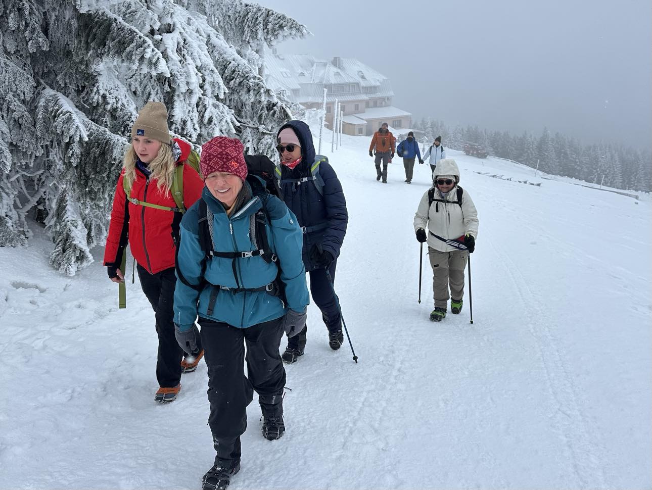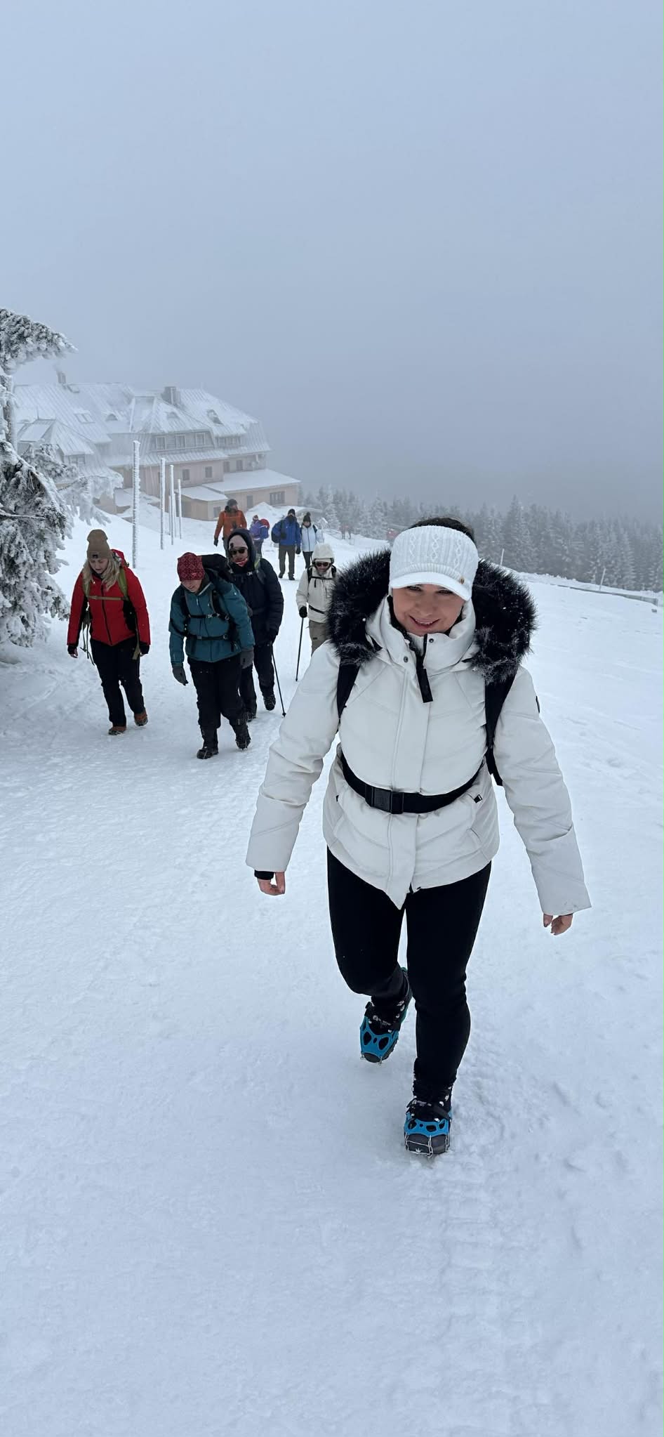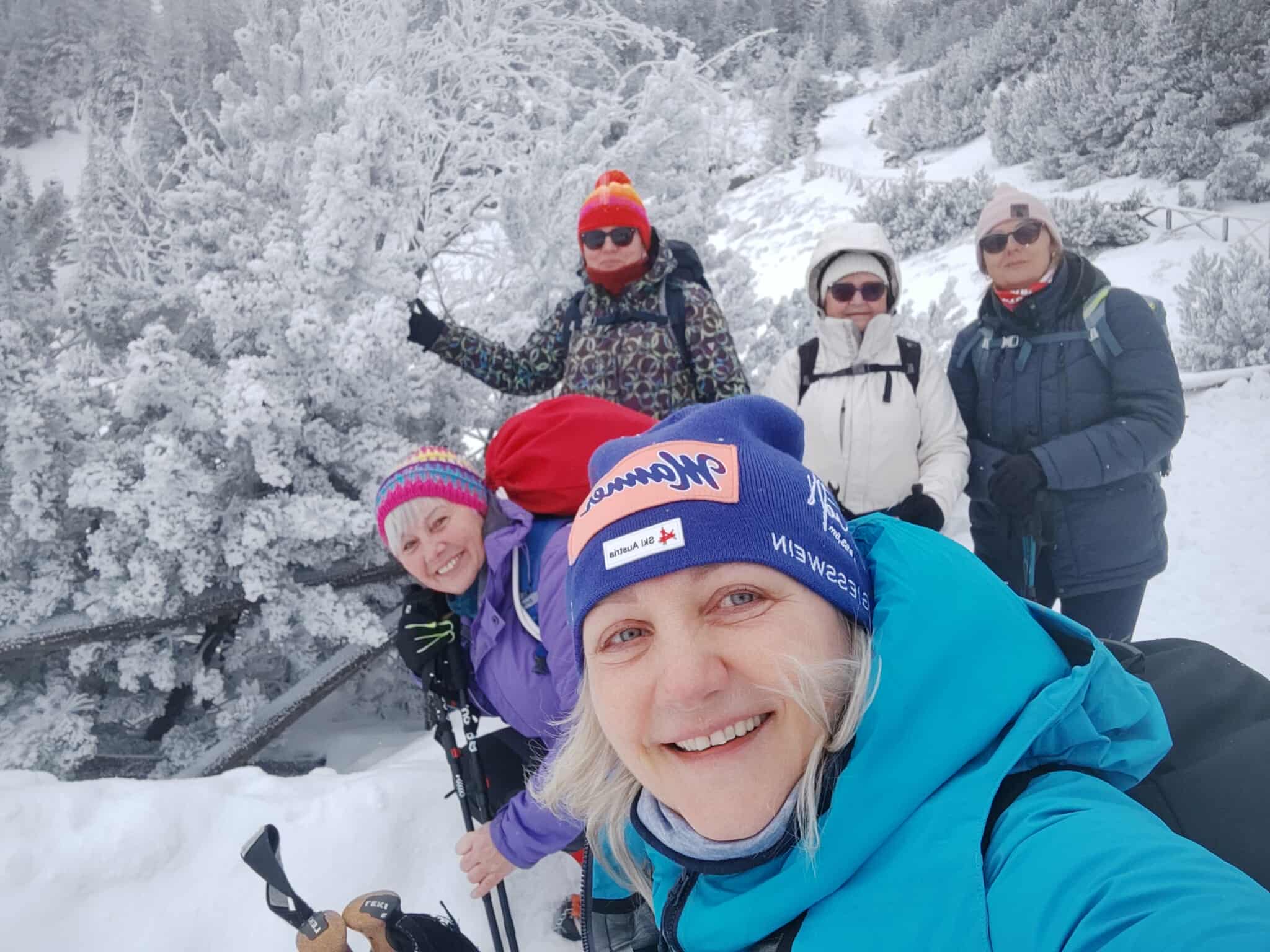 Początkowo warunki były wymagające – niska temperatura i silny wiatr potęgowały uczucie chłodu, a zmrożony śnieg na trawersach wymagał ostrożności i koncentracji. W niektórych miejscach oblodzona ścieżka i strome zbocza podnosiły poziom adrenaliny, przypominając o potędze i nieprzewidywalności gór. Z czasem jednak pogoda wynagrodziła nasze wysiłki. Pojawiło się tak zwane „okienko pogodowe” – wiatr ucichł, a zza chmur zaczęło przebijać się słońce. Oświetlone jego promieniami drzewa i krzewy pokryte lodem wyglądały jak kryształowe rzeźby. Każdy widział w nich coś innego: fantastyczne postacie, zwierzęta czy bajkowe kształty. Był to moment, w którym góry pokazały swoją najbardziej magiczną, niemal nierealną stronę.