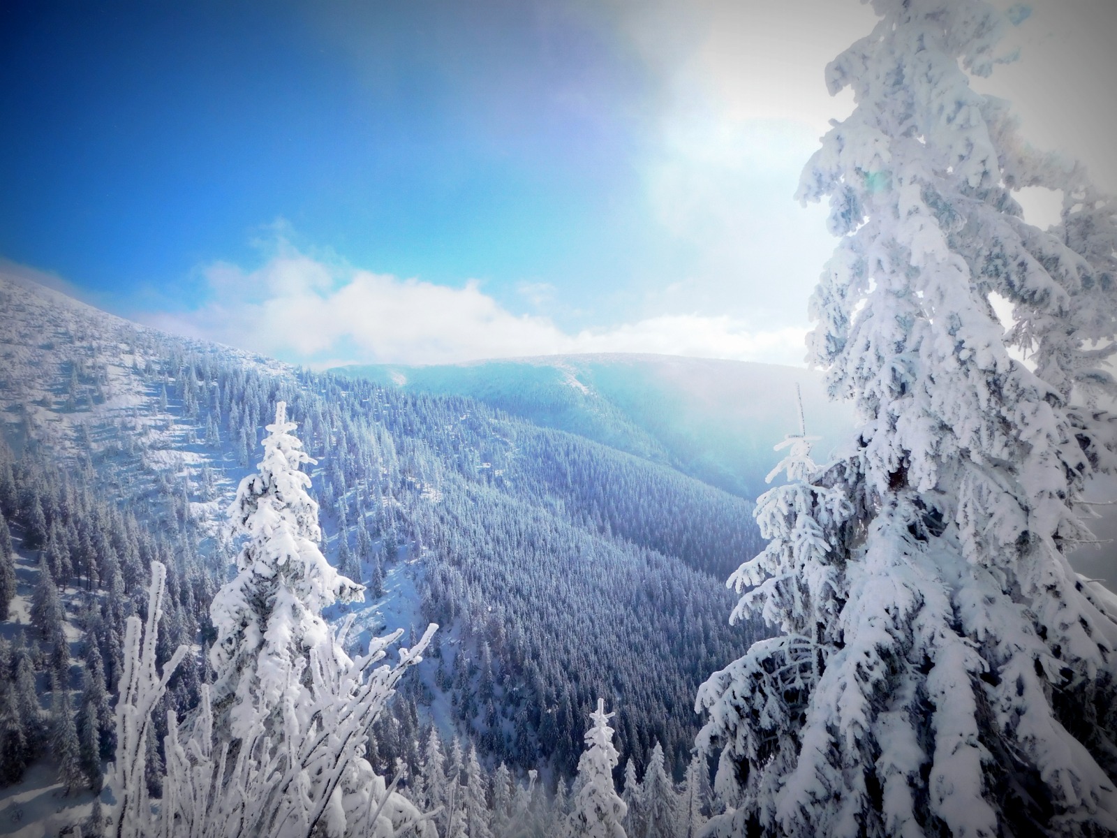 Naszą wędrówkę rozpoczęliśmy przy Świątyni Wang, skąd szlak prowadził przez ośnieżone polany i gęsty, świerkowy las. Drzewa były pokryte grubą warstwą szadzi i lodu, a ich gałęzie uginały się pod ciężarem zimowego pancerza. Każdemu krokowi towarzyszył charakterystyczny skrzyp śniegu pod butami, a powietrze było rześkie, czyste i przesycone górską ciszą. Zima ukazała tu swoje prawdziwe oblicze – surowe, ale jednocześnie niezwykle piękne.