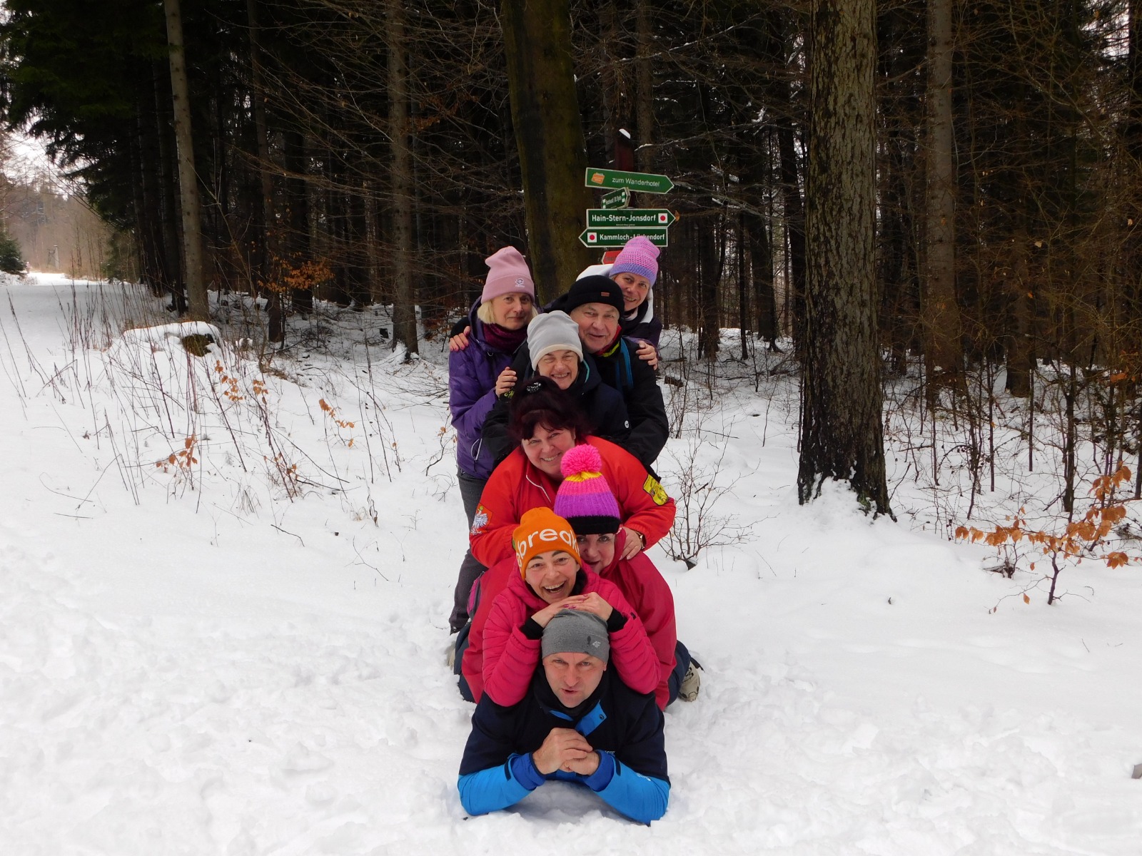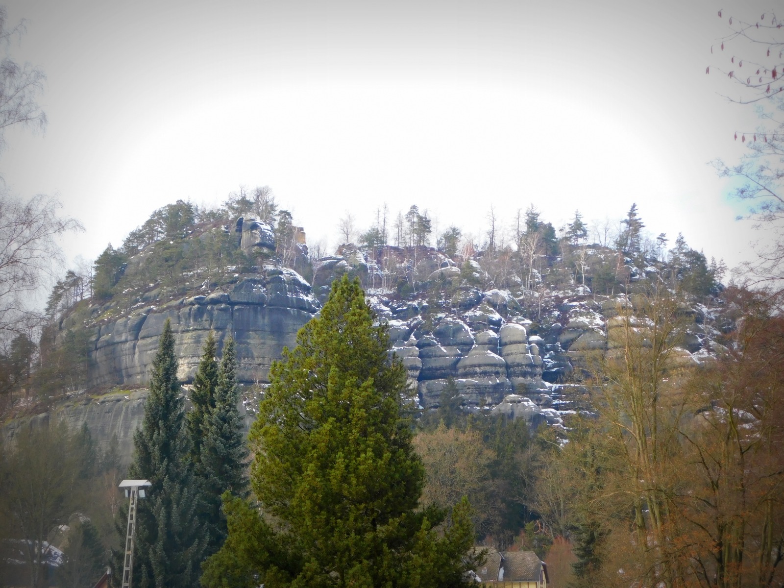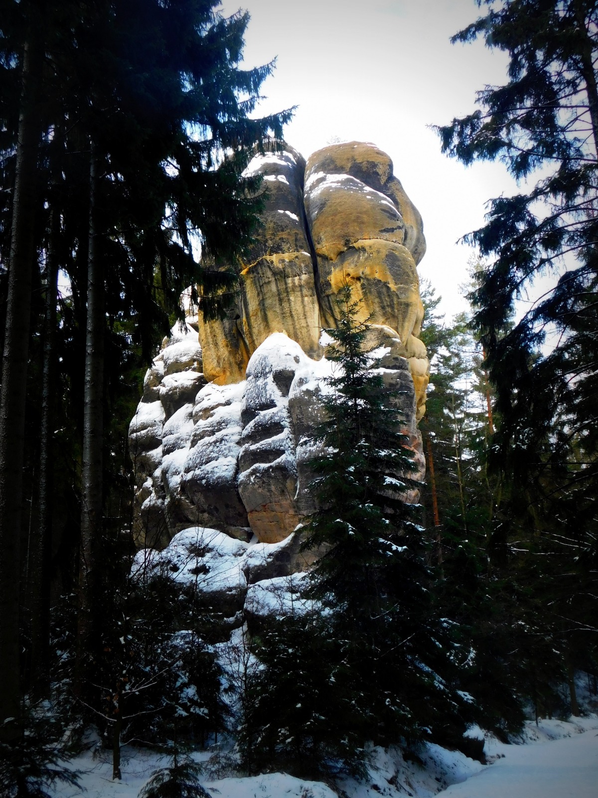 W drodze powrotnej w kierunku Oybin śnieg nadal padał jak delikatny puch gęsi, nadając wędrówce niemal bajkowy charakter. To właśnie na tym odcinku mijaliśmy charakterystyczne formy skalne zwane „grzybkami” lub „kielichami”. Ich czerwonawy kolor skały pięknie kontrastował z bielą świeżego śniegu, a fantazyjne kształty przypominały ogromne kamienne kapelusze wyrastające z ziemi. Pokryte śniegiem wyglądały wyjątkowo malowniczo i stanowiły jedną z największych atrakcji tej trasy.