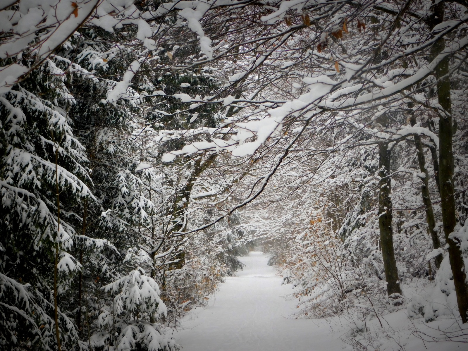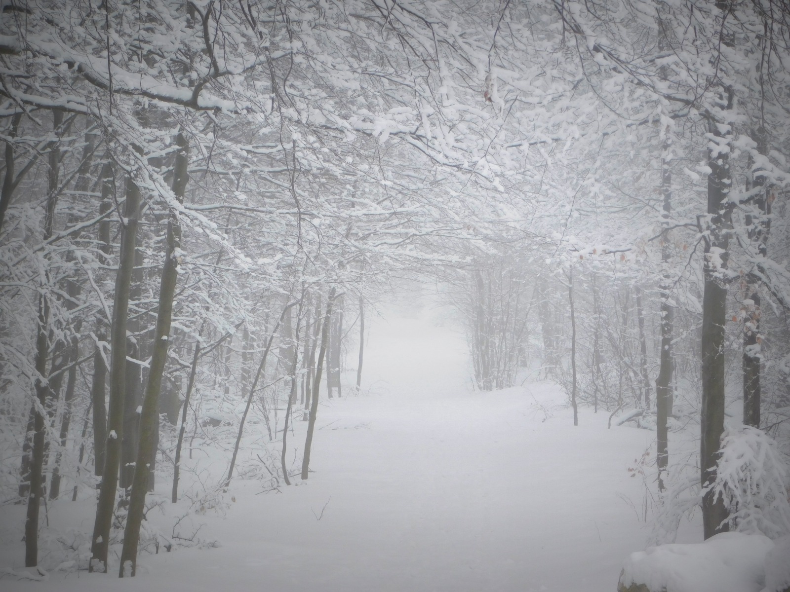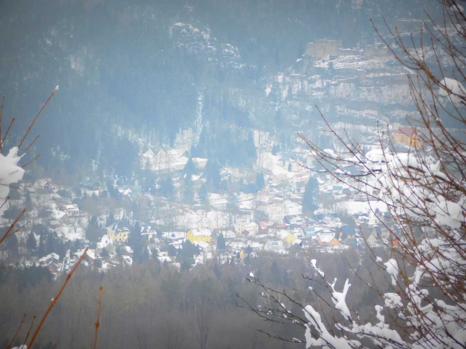 W drodze powrotnej w kierunku Oybin śnieg nadal padał jak delikatny puch gęsi, nadając wędrówce niemal bajkowy charakter. To właśnie na tym odcinku mijaliśmy charakterystyczne formy skalne zwane „grzybkami” lub „kielichami”. Ich czerwonawy kolor skały pięknie kontrastował z bielą świeżego śniegu, a fantazyjne kształty przypominały ogromne kamienne kapelusze wyrastające z ziemi. Pokryte śniegiem wyglądały wyjątkowo malowniczo i stanowiły jedną z największych atrakcji tej trasy.