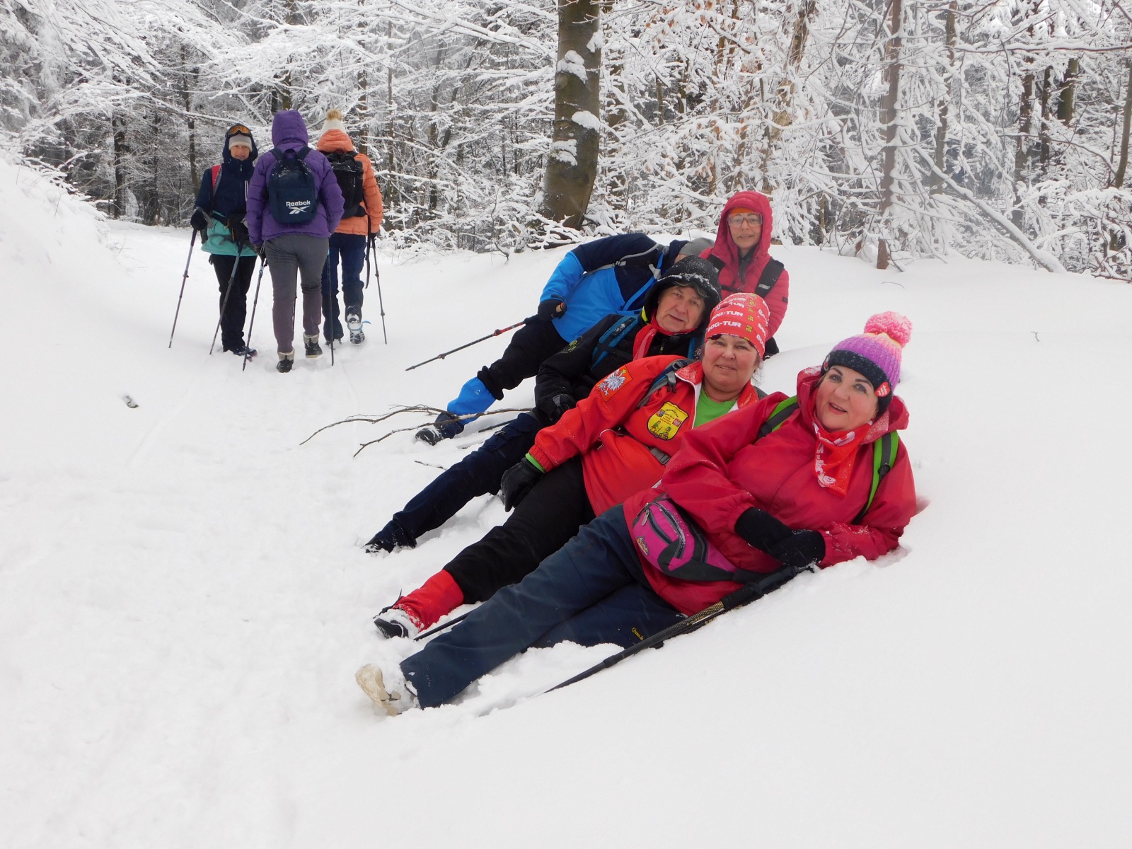 Już podczas podejścia śnieg delikatnie padał, tworząc niezwykłą zimową atmosferę. Białe płatki spokojnie opadały na drzewa, szlak i wędrowców. Na trasie można było spotkać wiele rodzin z dziećmi, które wraz z rodzicami zjeżdżały na sankach, ciesząc się zimą i wspólną górską przygodą.