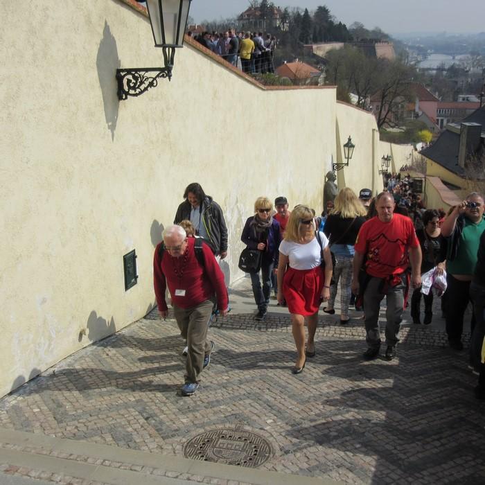 Pierwszą atrakcją po przyjeździe do miasta była jazda metrem do stacji Malostranska skąd poszliśmy zobaczyć ogrody Valenszteina. Ogrody te znajdują się przy barokowym pałacu Wallenstainów niedostępnym dla zwiedzających ponieważ mieści się tu teraz czeski senat. W ogrodach oprócz pięknych kwiatów i krzewów szczególną uwagę przyciąga sztuczna grota z imitacją nacieków skalnych a także piękna loggia Sala Terrana z 1672 roku, którą tworzą trzy monumentalne łuki arkadowe z przedstawieniem wojny trojańskiej wewnątrz. Starymi schodami udaliśmy się do Zamku Praskiego na którym codziennie o 12:00 odbywa się zmiana warty. Dwa regimenty , które uczestniczą w tej zmianie wart przekazują sobie nawzajem sztandar Prezydenta Republiki Czeskiej a wartownicy na posterunkach wymieniają się w takt muzyki granej przez orkiestrę. To widowisko warte obejrzenia, polecam.