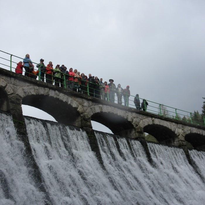 Pogoda tego dnia nas nie rozpieszczała, padał deszcz ale dla piechura to żadna przeszkoda - wkłada pelerynę i rusza w drogę. Pierwszego dnia przeszliśmy około 20 km z Karpacza do Bukowca zwiedzając po drodze Zaporę Kamienną na rzece Łomnicy, a także zespół pałacowo – ogrodowy w Bukowcu. Wybudowano go w II połowie XVI wieku jako renesansowy dwór, długa jest lista byłych właścicieli ale znamienitą dla zamku była rodzina Redenów, która dokonała gruntownej przebudowy w stylu klasycystycznym. Utworzyli też pierwszy na Dolnym Śląsku park krajobrazowy. Obecnie w pałacu mieści się siedziba Związku Gmin Karkonoskich, a park i folwark wydzierżawiła Fundacja ”Dolina Pałaców i Ogrodów Kotliny Jeleniogórskiej” i stworzyła tu centrum edukacyjno-szkoleniowe. Po zwiedzeniu Pawilonu Herbacianego hrabiny von Reden udaliśmy się do autobusu i pojechaliśmy na nocleg do Staniszowa do schroniska PTSM. Kiedyś mieściła się tutaj szkoła. W latach 2007-2013 budynek został całkowicie wyremontowany i zmodernizowany dzięki Funduszowi Rozwoju Regionalnego.