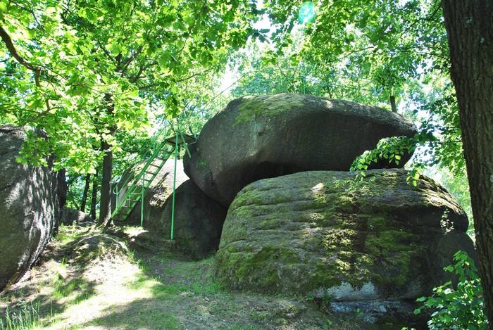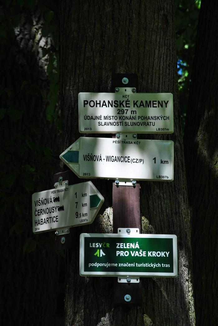Druga grupa, wyjechała o godzinę później (10.00), droga zdecydowanie, łatwiejsza i krótsza. Ok. 15 km do Višňovej, przejazd przez Markocice, czeskie: Heřmanice, Kunratice, Viskę do Višňovej, gdzie na wzgórzu leżą „Pogańskie Kamienie”, grupa skał z rumburskiego granitu powstałych w okresie neolitu a według legend czczona przez starożytnych pogan. Przed przyjazdem naszych koleżanek i kolegów, szybko przygotowaliśmy istniejące palenisko, znieśliśmy chrust z okolicznego lasku, jak również patyki na kiełbaski. Długo na nich nie musieliśmy czekać i już wspólnie piekliśmy kiełbaski oraz intensywnie uzupełnialiśmy płyny, ponieważ z nieba lał się żar (na rowerowym termometrze 30 stopni).