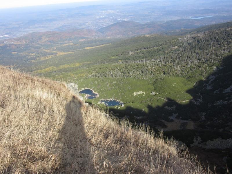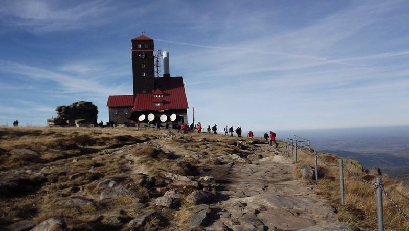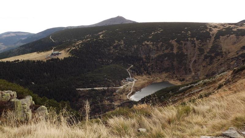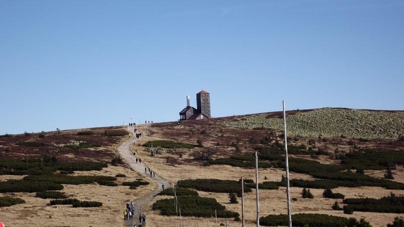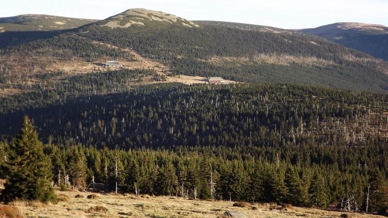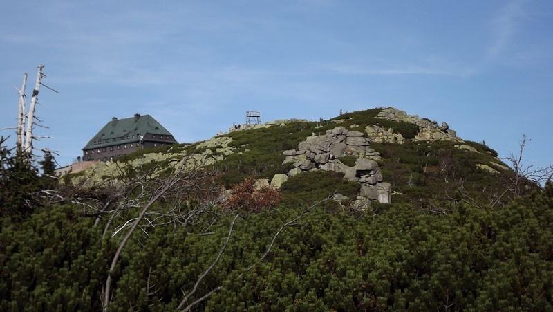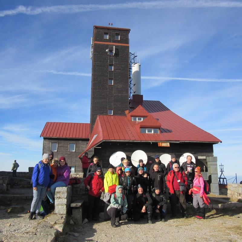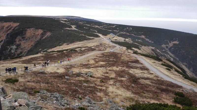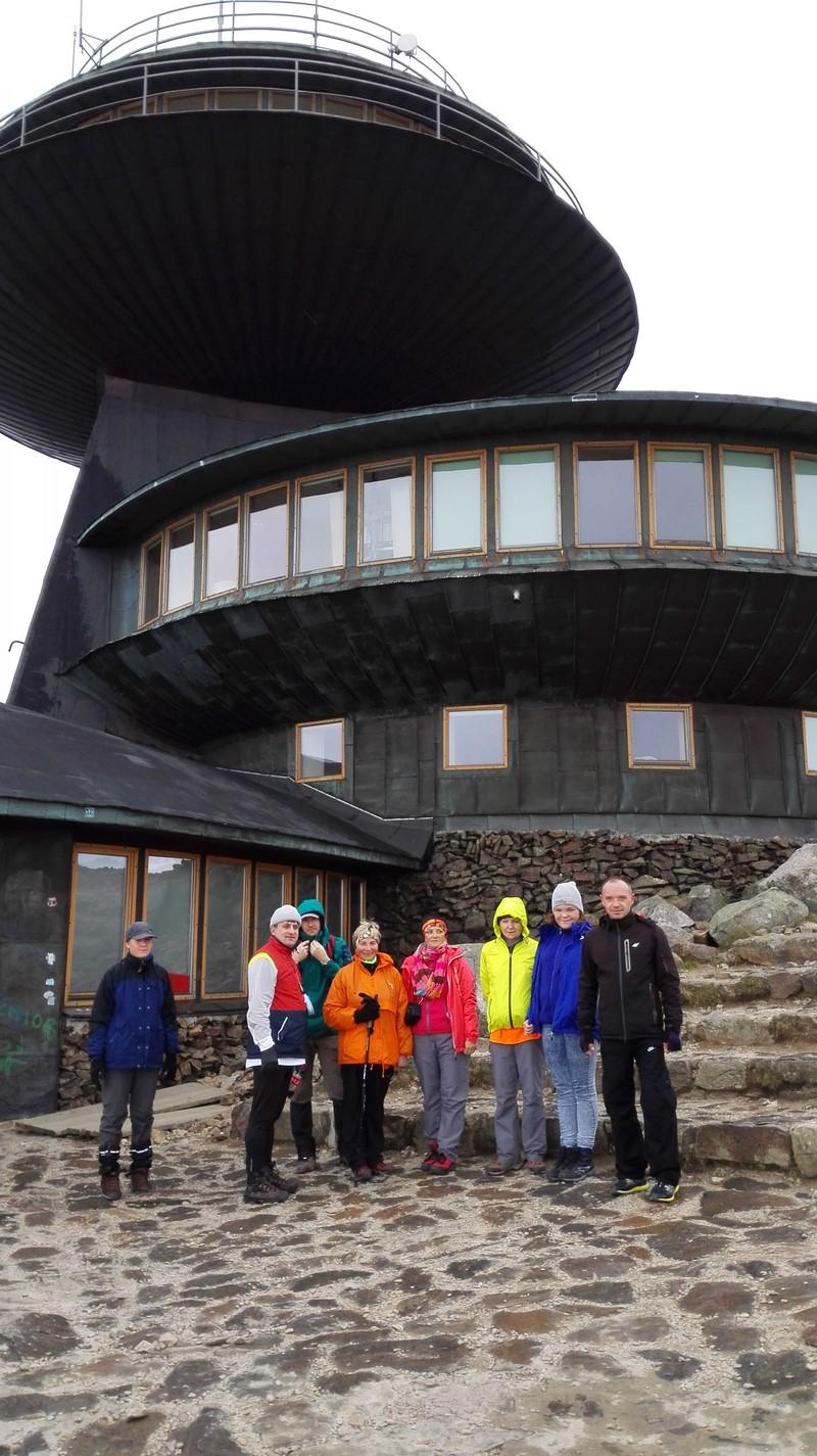 Pomaszerowaliśmy dalej przez Halę Szrenicką, Trzy Świnki, Twarożnik, Halę pod Łabskim Szczytem do Śnieżnych Kotłów. Postój był tu konieczny. Roztaczające się widoki na Karkonosze, Góry Izerskie, Góry Kaczawskie, Rudawy Janowickie oraz Kotlinę Jeleniogórską nie pozwalały się zignorować. Przed dawnym schroniskiem - od pół wieku stacją przekaźnikową - zrobiliśmy pamiątkową fotografię. Zbudowane w 1837 r. na polecenie hrabiego Schaffgotscha jako Schneegrubenbaude przyjmowało gości do maja 1961 r.
