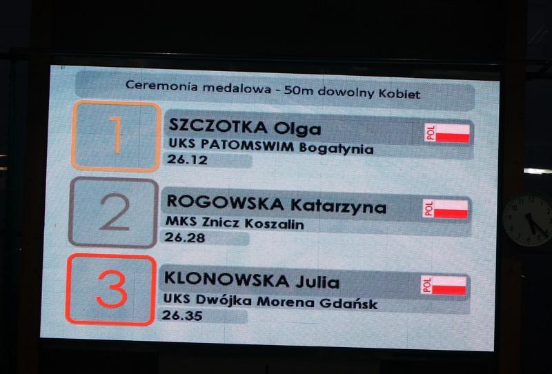 W wyścigu finałowym, w którym walka toczyła się o medale, Olga nie pozostawiła złudzeń, że do krajowego sprintu z wielkim impetem wjeżdża (a właściwie „wpływa”) nowa zawodniczka z Bogatyni. Czas 26.12 sekundy zaowocował ZŁOTEM i wprawił w euforiępozytywnych emocji. Dnia następnego na porannych eliminacjach odbyły się starty na: 50m stylem grzbietowym (Olga), 50m stylem motylkowym (Olga, Kamila, Roksana). Tu kolejne miłe zaskoczenie - Olga w grzbiecie z wynikiem 30.17 weszła do finału A z czwartej pozycji, oraz na 50m stylem motylkiem z wynikiem 29.78 z dziesiątej pozycji. Kamila startująca tzw. delfinem osiągnęła wynik 30.05 i zakwalifikowała się z 16 pozycji do finału B. Najbardziej poszkodowana Roksana dopłynęła na 62 pozycji. W związku z większymi szansami Olgi na medal w grzbiecie została podjęta decyzja o rezygnacji z finału w stylu motylkowym. Kamila jako pierwsza wystartowała w finale B i uzyskując identyczny czas jak w eliminacjach zajęła 15 miejsce w Polsce. Olga w niezwykle emocjonującym wyścigu zdobyła brązowy medal uzyskując bardzo dobry rezultat 29.40 sek. Kolejne powody do dumy - wszyscy widzą zawodniczkę z Bogatyni na podium w zupełnie innym stylu. Ostatniego dniabyły dystanse dłuższe 100m dowolnym i grzbietem oraz najdłuższy, a zarazem najcięższy wyścig Kamili czyli 200m „delfinem”. Stylem motylkowym Kamila o ponad 7 sekund poprawiła rekord życiowy uzyskując 27 lokatę. Finał na 100m dowolnym to przedłużony sprint, w którym trzebawykazać się szybkością i wytrzymałością jednocześnie. Reprezentantka MiG Bogatynia z dużą pewnością weszła na słupek po czym, po 56,55 sekundach zdobyła kolejne ZŁOTO stawiając „kropkę nad i”, by za chwile wziąć udział w finale B grzbietem i poprawić wynik z eliminacji zajmując 13 miejsce w kraju.