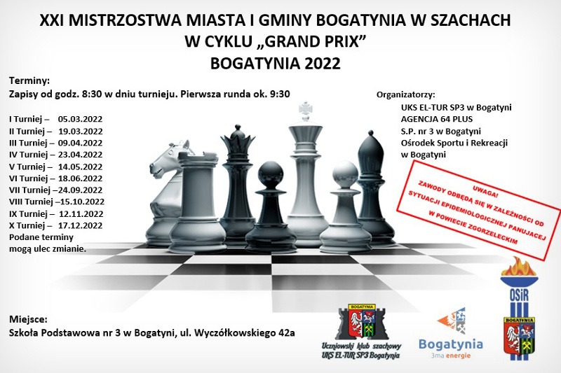 Serdecznie zapraszamy do udziału w XXI Mistrzostwach Miasta i Gminy w Szachach w cyklu „GRAND PRIX”. W tym roku planowane jest rozegranie dziesięciu turniejów.