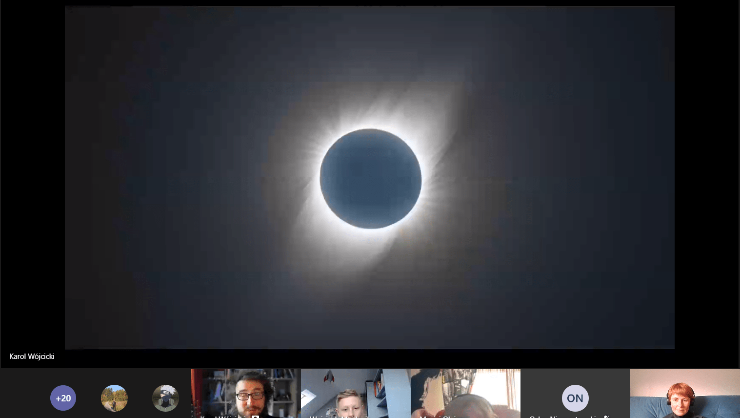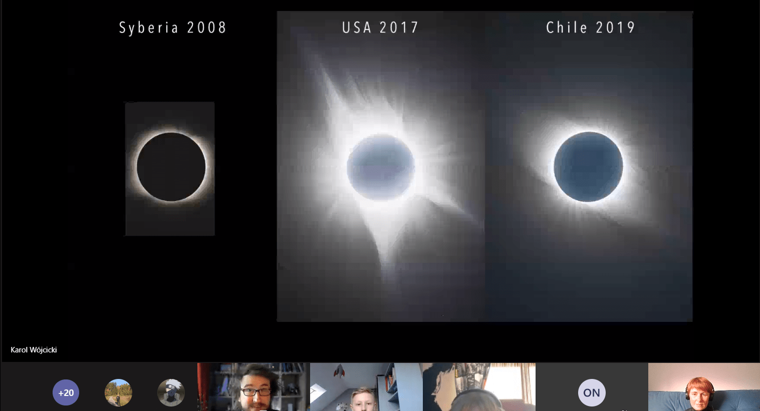 Najwięcej czasu pan Karol poświęcił zaćmieniu Słońca. Omówił genezę powstania tego zjawiska oraz jego rodzaje. Dowiedzieliśmy się, że ostatnie całkowite zaćmienie Słońca widoczne w Polsce miało miejsce w 1954 roku, a najbliższe będzie w 2135 roku. Przedstawił nam „zaćmieniowy rozkład jazdy”, czyli gdzie i o której należy stanąć w zaćmieniowym cieniu. On sam miał szczęście uczestniczyć w czterech takich wydarzeniach: na Syberii, w Chinach, USA i Chile. Pokazał nam filmy i zdjęcia z tych wyjazdów. Wszystkie te obrazy oraz sposób, w jaki o tym opowiadał, wywarły na nas wielkie wrażenie.