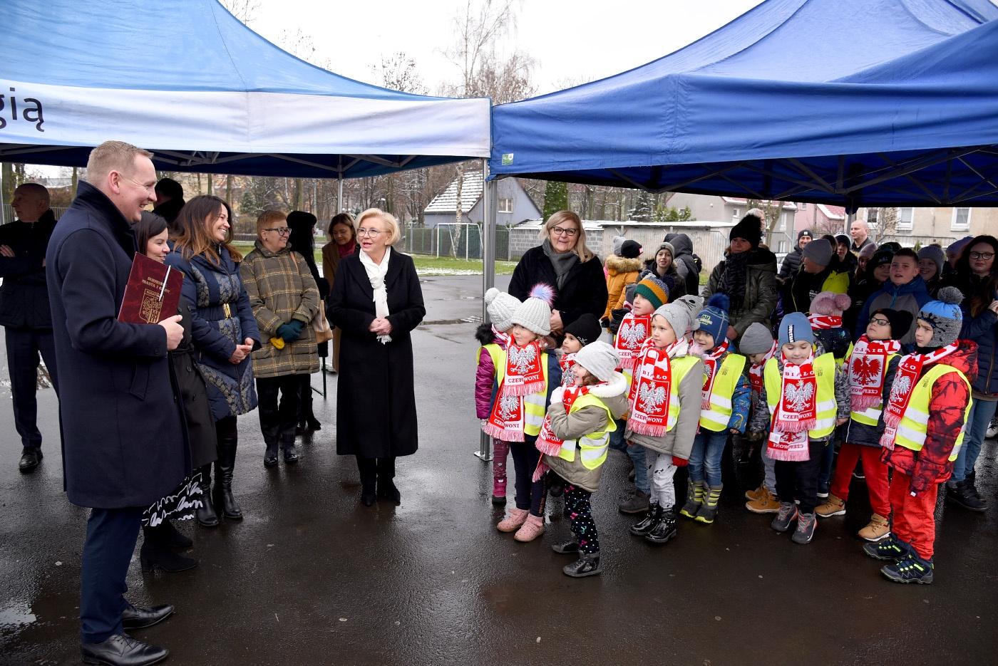 Strefę młodego kibica utworzyli na tą okoliczność uczniowie z SP 1 i rozśpiewane przedszkolaki z PP nr 4, które zaprezentowały się w barwach narodowych. Dzieci otrzymały od pani mister słodkie upominki i drobny sprzęt sportowy. Przy okazji inauguracji sali, o nowe steppery wzbogaciła się także zlokalizowana w niej miejska siłownia. Minister Marzena Machałek i burmistrz Wojciech Dobrołowicz odwiedzili bogatyński żłobek, który także został zasilony rządowymi funduszami z programu Maluch + (łącznie ok. 50 000 zł), a następnie uczestniczyli w roboczym spotkaniu z samorządowcami.