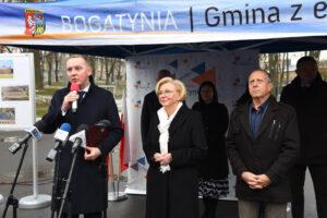 Sekretarz Stanu w Ministerstwie Edukacji i Nauki Marzena Machałek oraz samorządowcy z naszego regionu – beneficjenci pierwszej edycji Programu Inwestycji Strategicznych Polski Ład, na zaproszenie burmistrza Wojciecha Dobrołowicza przybyli do Bogatyni, by porozmawiać o rządowych funduszach. Kwoty są imponujące, ponieważ z Polskiego Ładu samorządy naszego powiatu otrzymały łącznie ponad 62 000 000 zł, a sama gmina Bogatynia 10 450 000. Okazją do spotkania był dofinansowany z innego rządowego programu – Sportowa Polska, właśnie zakończony remont elewacji i dachu budynku sali gimnastycznej przy ul. Sportowej, wraz z montażem paneli fotowoltaicznych. To pierwsza gminna inwestycja, która została w całości zrealizowana za kadencji Wojciecha Dobrołowicza. Dzięki niej, zabytkowy obiekt w centrum miasta wygląda imponująco i stał się bardziej efektywny energetycznie. Koszt remontu to 774 760 zł, zadanie uzyskało 379 100 zł dofinansowania w ramach wspomnianego Programu rozwoju lokalnej infrastruktury sportowej Sportowa Polska. Podczas uroczystego otwarcia hali nie zabrakło gospodarzy OSiR-u i przedstawicieli klubów sportowych.