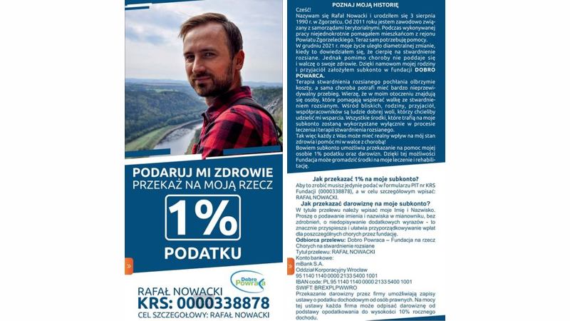 Nazywam się Rafał Nowacki i urodziłem się 3 sierpnia 1990 r. w Zgorzelcu. Od 2011 roku jestem zawodowo związany z samorządami terytorialnymi. Podczas wykonywanej pracy niejednokrotnie pomagałem mieszkańcom z rejonu Powiatu Zgorzeleckiego. Teraz sam potrzebuję pomocy. W grudniu 2021 r. moje życie uległo diametralnej zmianie, kiedy to dowiedziałem się, że cierpię na stwardnienie rozsiane. Jednak pomimo choroby nie poddaję się i walczę o swoje zdrowie.