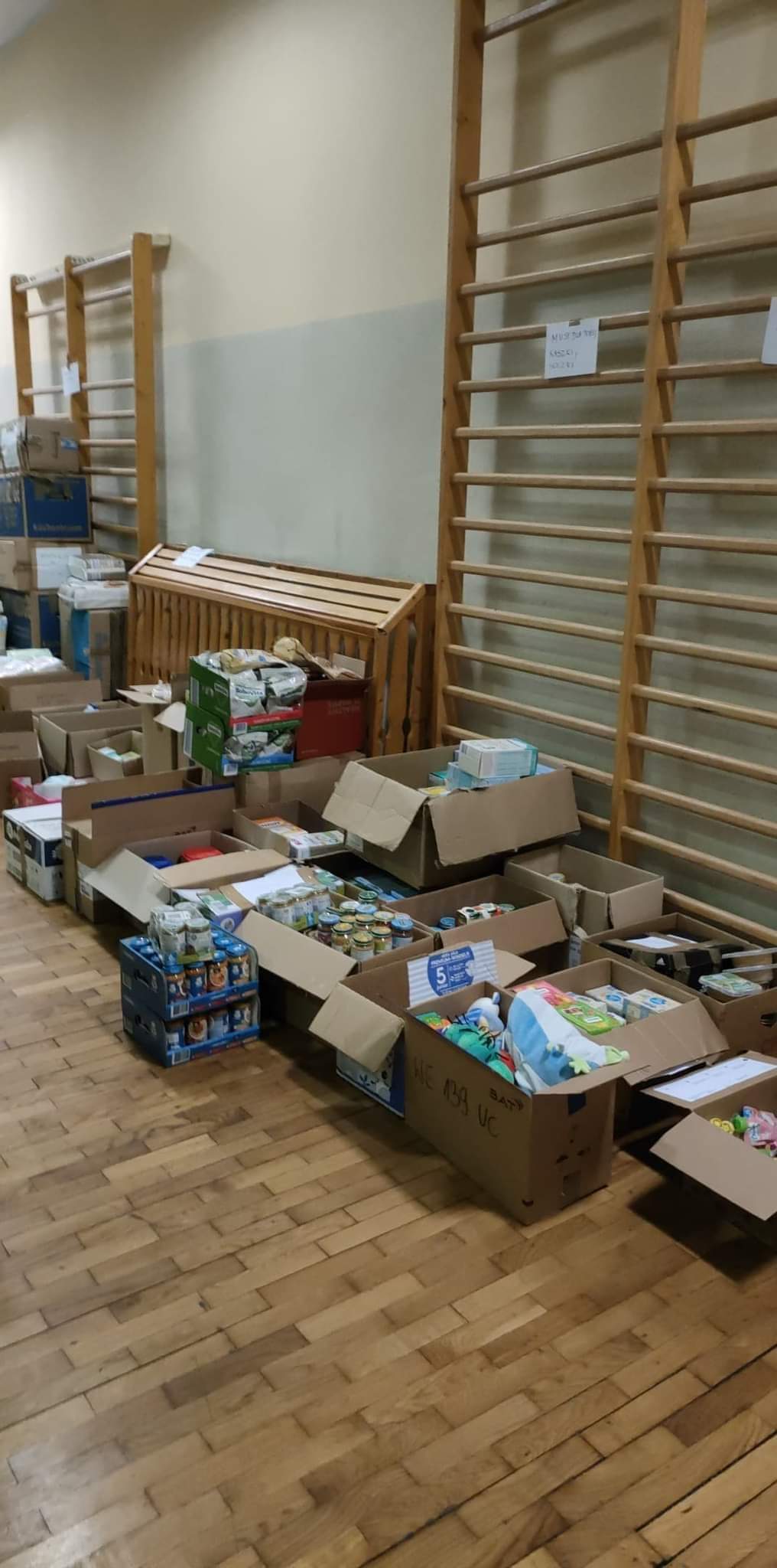 W Liceum Ogólnokształcącym również praca wre. Cały czas trwa segregacja i układanie tych wszystkich rzeczy, które zostały dostarczone do punktu.