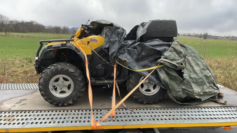 Policjanci z bogatyńskiego komisariatu podczas służby patrolowej zauważyli busa, który miał podpięta lawetę z plandeką. Funkcjonariusze zatrzymali kierującego Mercedesem do kontroli drogowej. Okazało się, że pod plandeką znajduje się quad. Po sprawdzeniu w dostępnych bazach danych pojazd okazał się tym skradzionym kilka godzin wcześniej. W busie oprócz 28-letniego kierującego był 34-letni pasażer. Quad został zabezpieczony na policyjnym parkingu, a mężczyźni trafili do komisariatu.