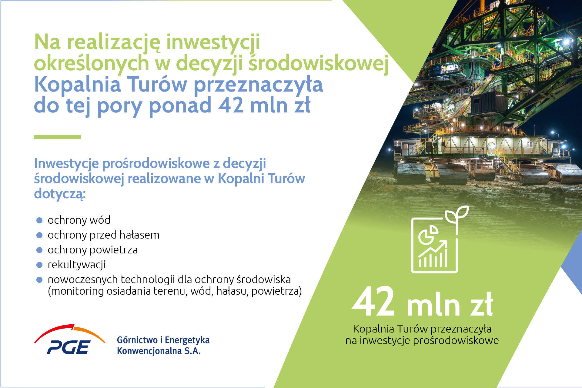 Kopalnia Turów konsekwentnie realizuje wszystkie zapisy decyzji środowiskowej wydanej przez Generalnego Dyrektora Ochrony Środowiska, wśród których znajdują się liczne inwestycje proekologiczne ograniczające wpływ kopalni na środowisko naturalne i gwarantujące prowadzenie działalności z zasadą zrównoważonego rozwoju.