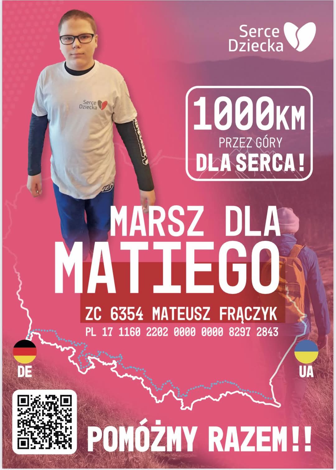 Jednak ten ambitny marsz ma znacznie głębszy sens niż tylko osobista satysfakcja czy realizacja górskiej pasji. Tomasz Kowalski postanowił nadać tej drodze wymiar charytatywny, wspierając chorego chłopca. Jego wybór padł na Mateusza Frączyka, Podopiecznego Fundacji Serce Dziecka. Mateusz to dziecko, które oprócz złożonej wady serca zmaga się również z autyzmem i wieloma schorzeniami genetycznymi, wymagając stałej i kosztownej opieki.