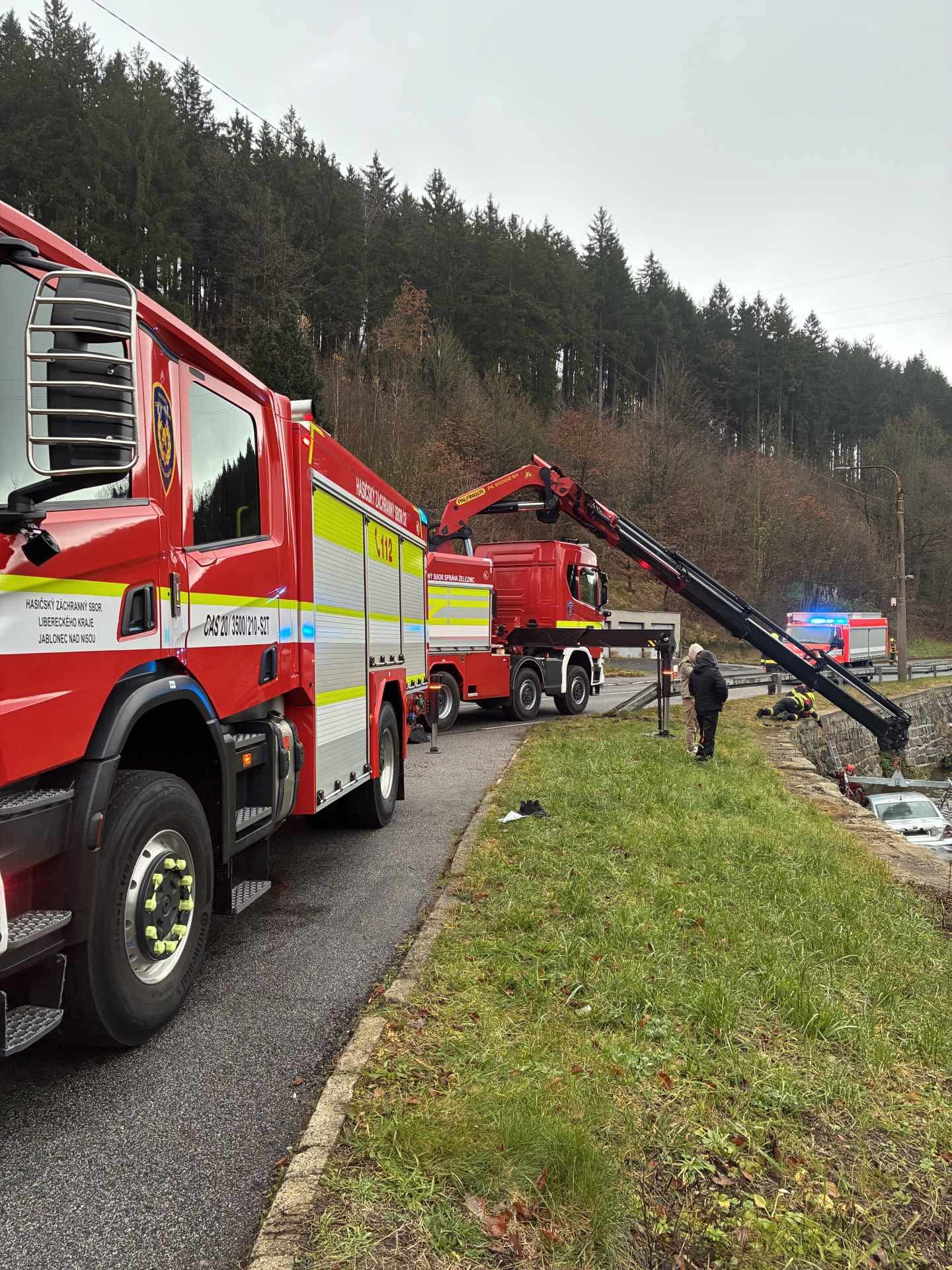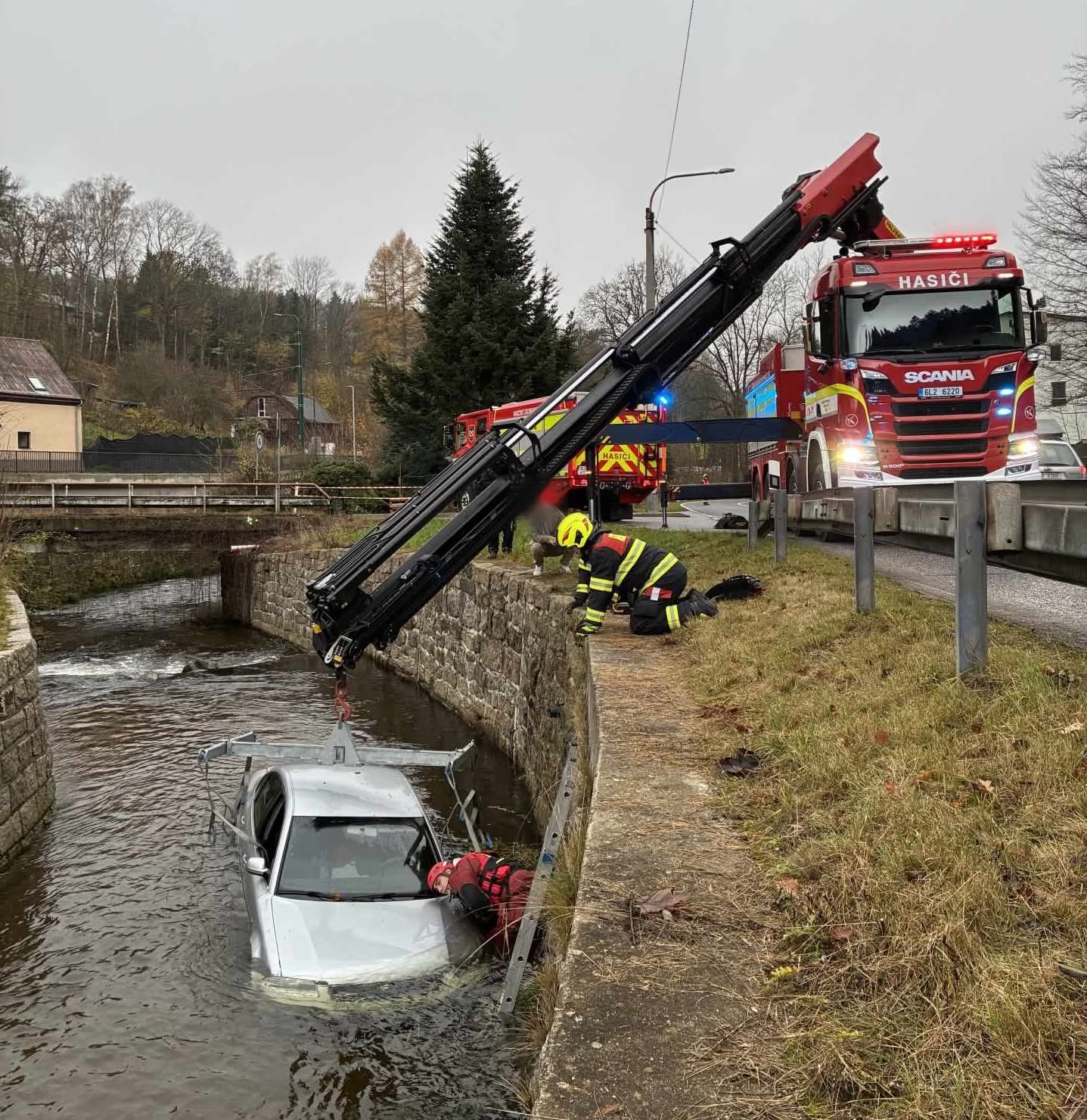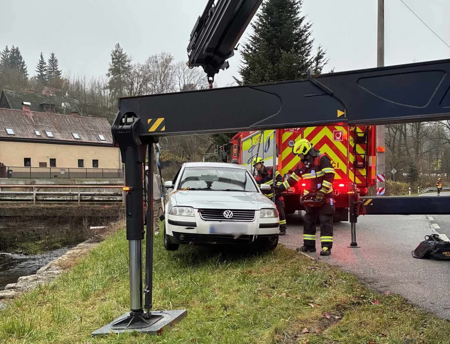 Na miejsce natychmiast wezwano straż pożarną. Rzeczniczka strażaków, Jaroslava Benešová, poinformowała, że konieczne było użycie specjalistycznego samochodu ratownictwa technicznego, sprowadzonego od strażaków kolejowych, aby wydobyć auto z nurtu wody.
