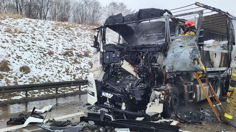 Siła uderzenia była na tyle duża, że w kabinie MAN-a doszło do pożaru. Ogień błyskawicznie zajął przód pojazdu. 57-letni sprawca zdarzenia został ewakuowany z wraku i niezwłocznie przetransportowany przez zespół ratownictwa medycznego do najbliższego szpitala. Na ten moment stan jego zdrowia nie jest publicznie znany.