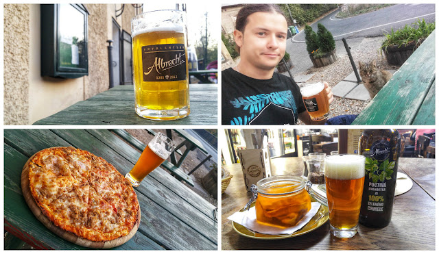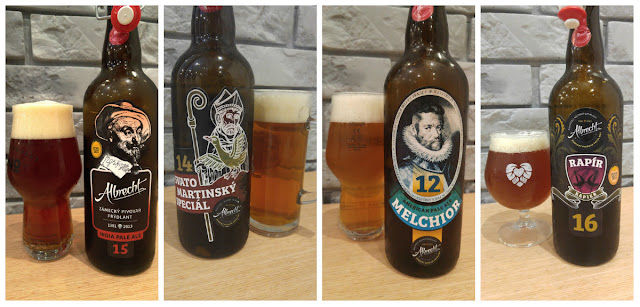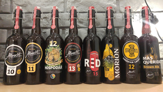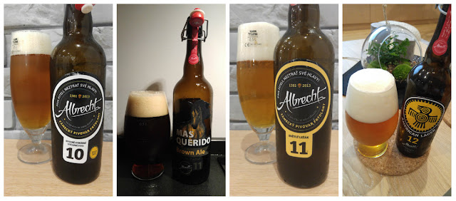 Dwa tygodnie później ponownie, tym razem w drodze do Liberca, zawitałem do Albrechta po piwa na wynos. Albrecht IPA 15 łączy mięciutką, wręcz zamszową słodowość z lekką słodyczą i silną goryczką. Obecny w bukiecie karmel jest stonowany i wyczuwalnie zamierzony. Owocowość chmielowa przeplata się z ziołowymi motywami i wprawdzie nie jest to lupulinowa bomba, ale w dalszym ciągu aromatyczna kompozycja, przekonująca harmonią. Świetne piwo (7,5/10). Kolejnym pilsem w albrechtowej kolekcji jest Svatomartinsky Special (ekstr. 14%, alk. 6,1%). Ziołowe chmiele są tutaj wycofane na rzecz bardziej podkreślonej słodowości, chlebowości i słodyczy resztkowej. Jest to jedno z nielicznych piw z tego browaru, w którym wyczułem diacetyl, jest on jednak na bardzo umiarkowanym, rozsądnym poziomie. Dobre piwo o wysokiej pijalności (6,5/10). Albrecht Melchior APA (ekstr. 12%, alk. 5,3%) to głównie cytrusy (pomarańcze, mandarynki), ale i trochę marakui oraz kwiatów. Mięciutka faktura, wyważona kompozycja smakowa, z podkreśloną goryczką balansującą słodycz resztkową. Aromatyczne, bardzo smaczne piwo (7/10). Intensywną, aromatyczną ipą jest też Albrecht Rapir (ekstr. 16%, alk. 6,5%), chmielony Galaxy oraz Topazem. Bukiet jest prosty, rześki i silnie chmielowy. Limonka i cytryna nadają ton, kocie naleciałości są absolutnie minimalne, jest za to trochę żywicy. Bardzo mocna goryczka jest balansowana lekką słodyczą resztkową oraz miękkim ciałem. Bez zarzutów (7/10).