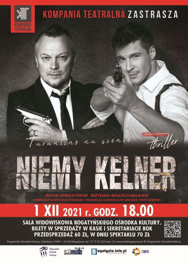 Kompania Teatralna i Bogatyński Ośrodek Kultury zaprasza Państwa do pokoju w dziwnym hotelu z dwoma co najmniej dziwnymi gangsterami, gdzie na zewnątrz zaczai się świat w postaci tajemniczego "dyspozytora". Jakże eksploatowany obecnie, zapowiadany już dawno przez Orwella, wszechobecny Wielki Brat. Para typów podejrzanego autoramentu to intrygujący motyw zarówno filmowy jak i literacki. U Becketta: Vladimir i Estragon, u Quentina Tarantino? A proszę, chociażby w Pulp Fiction! Pamiętacie taniec Travolty, psalmy głoszone przez Samuela L. Jacksona, czy też zegarek skrzętnie przechowany w-i po-ojcu Bruce'a Willisa…? Tarantino odrobił lekcje... My je sprawdzamy... Wy ocenicie... Dzięki bohaterom Niemego Kelnera, Benowi i Gusowi, Tarantino przedarł się wreszcie na scenę, tu, w Polsce. Komedia, groteska, thriller - decyzja należy do Was. Zapnijcie pasy... dbamy o Wasze bezpieczeństwo i poczucie humoru.