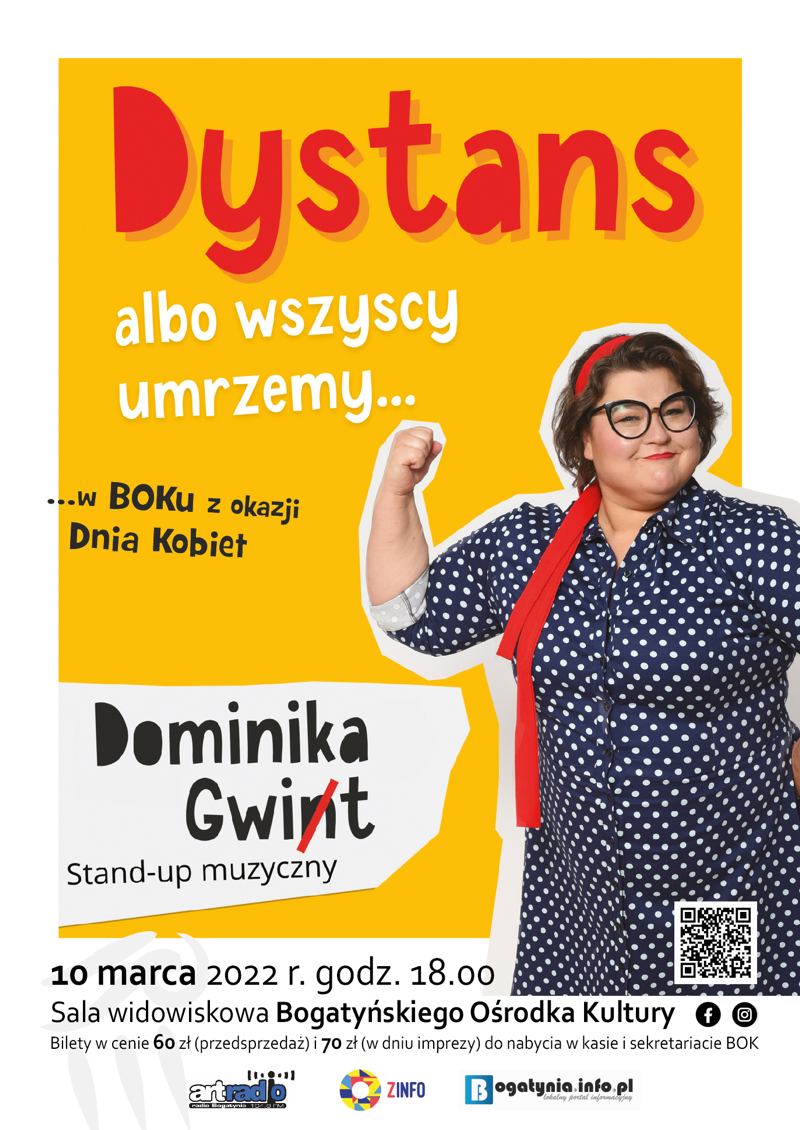 Dystans albo wszyscy umrzemy, to stand-up muzyczny w wykonaniu Dominiki Gwit z zespołem. Aktorka w zabawny sposób opowiada o życiu i o tym, dlaczego dystans do siebie i świata może polepszyć nam jakość życia! Historie z życia wzięte, okraszone są największymi hitami polskiej piosenki. Usłyszymy m.in. takie szlagiery jak „Boskie Buenos”, „Gdzie Ci mężczyźni”, „Ramię w ramię” czy „Dobranoc panowie”. Będzie dużo śmiechu i wzruszeń, a przede wszystkim życiowy dystans, którego wszyscy tak bardzo potrzebujemy! Autorem scenariusza jest mistrz słowa i gwiazda polskiego kabaretu Robert Górski. Zapraszamy na Dzień Kobiet do Bogatyńskiego Ośrodka Kultury.