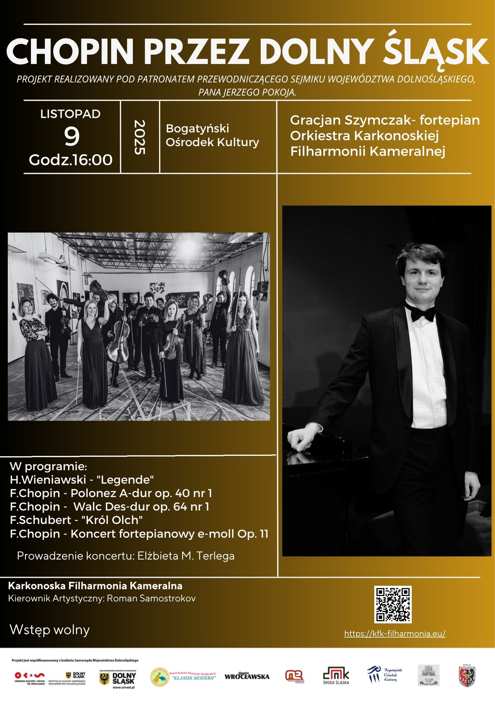 Koncert rozpocznie się o godzinie 16:00 w sali widowiskowej Bogatyńskiego Ośrodka Kultury. Projekt „Chopin przez Dolny Śląsk” jest współfinansowany ze środków budżetu Sejmiku Województwa Dolnośląskiego, dzięki czemu wstęp na wydarzenie jest wolny. To wyjątkowa okazja, by nieodpłatnie obcować z muzyką na najwyższym poziomie artystycznym. Serdecznie zapraszamy!