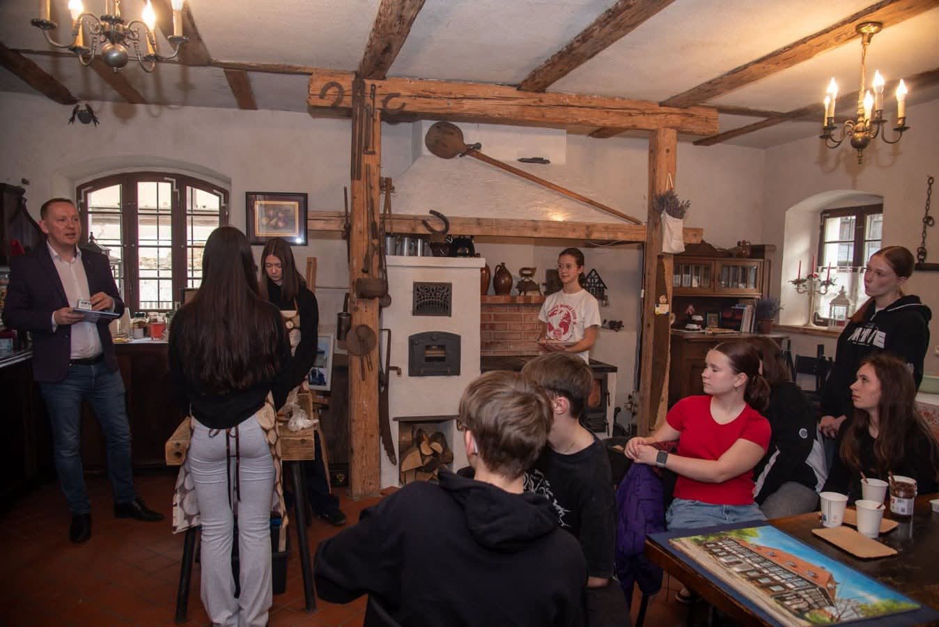 Wstęp do architektury regionu był jednak dopiero początkiem. Rolę gospodyni pełniła pani Krystyna Proch, właścicielka zabytkowej kuźni. Jej opowieści o historii obiektu pozwoliły uczniom przenieść się w czasie i zrozumieć, jak wyglądało życie w dawnych łużyckich domostwach.