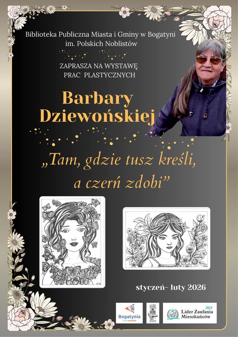 Biblioteka Publiczna Miasta i Gminy w Bogatyni im. Polskich Noblistów po raz kolejny staje się centrum lokalnej kultury. Przez najbliższe dwa miesiące goście placówki będą mieli okazję zanurzyć się w niezwykłym świecie rysunku, a wszystko to za sprawą ekspozycji prac Barbary Dziewońskiej pt. „Tam, gdzie tusz kreśli, a czerń zdobi”.