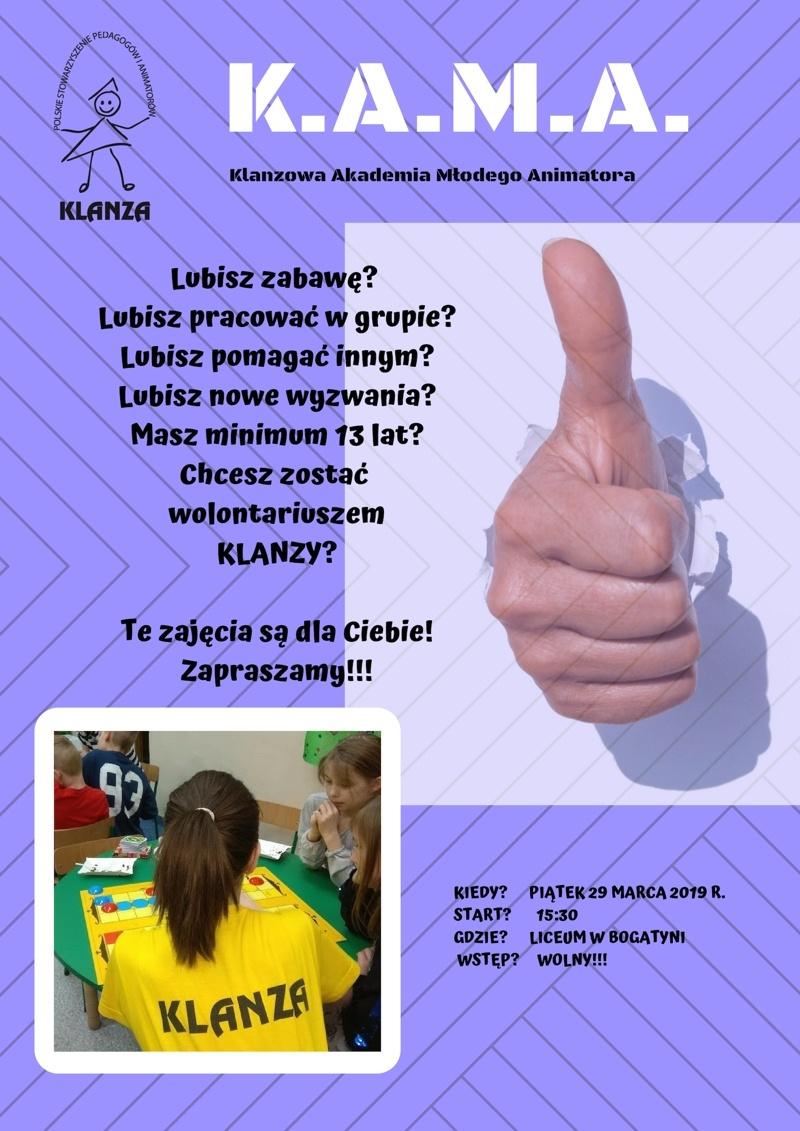 Polskie Stowarzyszenie Pedagogów i Animatorów KLANZA gorąco zaprasza młodzież (od 13 roku życia) na otwarte zajęcia Klanzowej Akademii Młodego Animatora. Głównym celem realizacji zajęć jest merytoryczne przygotowanie młodych ludzi do działań animacyjnych, wykształcenie liderów, którzy perspektywicznie będą działać wolontarystycznie, kierować młodzieżowym wolontariatem, pracować przy realizacji działań statutowych stowarzyszenia, a w przyszłości zasilą kadrę stowarzyszenia.
