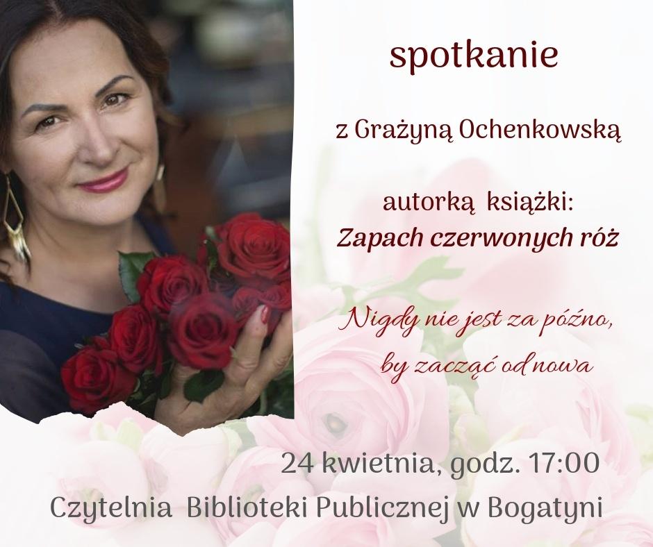 Biblioteka Publiczna Miasta i Gminy w Bogatyni oraz Elżbieta Kalwasińska zapraszają na spotkanie z Grażyną Ochenkowską autorką książki pt. "Zapach czerwonych róż", które odbędzie się 24 kwietnia 2019 r. o godz. 17:00 w Czytelni biblioteki.