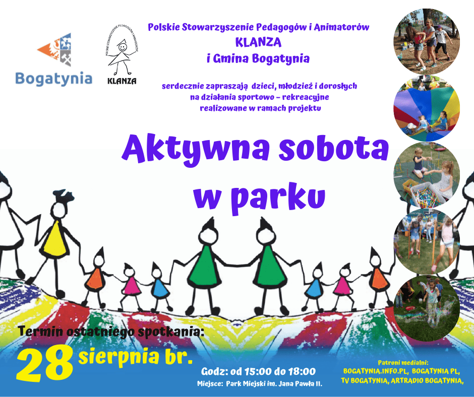 Polskie Stowarzyszenie Pedagogów i Animatorów KLANZA Oddział w Bogatyni oraz Gmina Bogatynia serdecznie zapraszają dzieci, młodzież i dorosłych na cykl działań sportowo-rekreacyjnych realizowanych w ramach projektu AKTYWNA SOBOTA W PARKU.