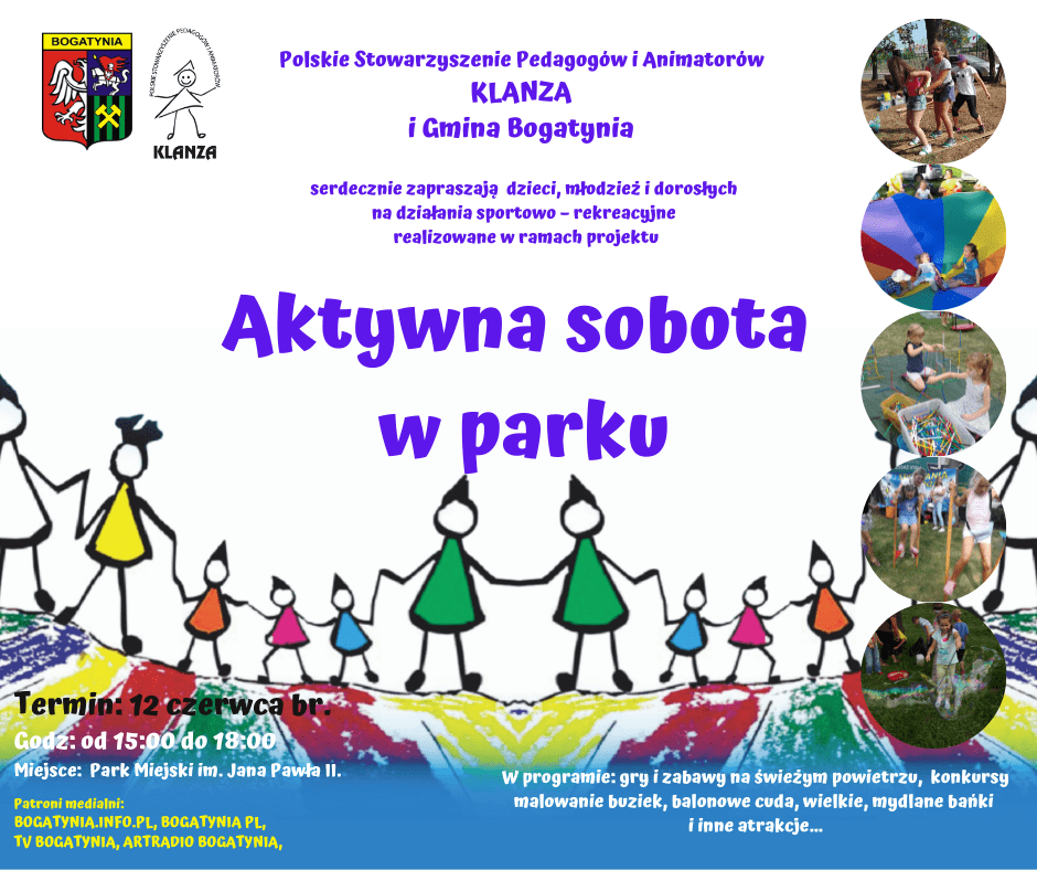 Polskie Stowarzyszenie Pedagogów i Animatorów KLANZA Oddział w Bogatyni oraz Gmina Bogatynia serdecznie zapraszają dzieci, młodzież i dorosłych na cykl działań sportowo – rekreacyjnych realizowanych w ramach projektu AKTYWNA SOBOTA W PARKU.