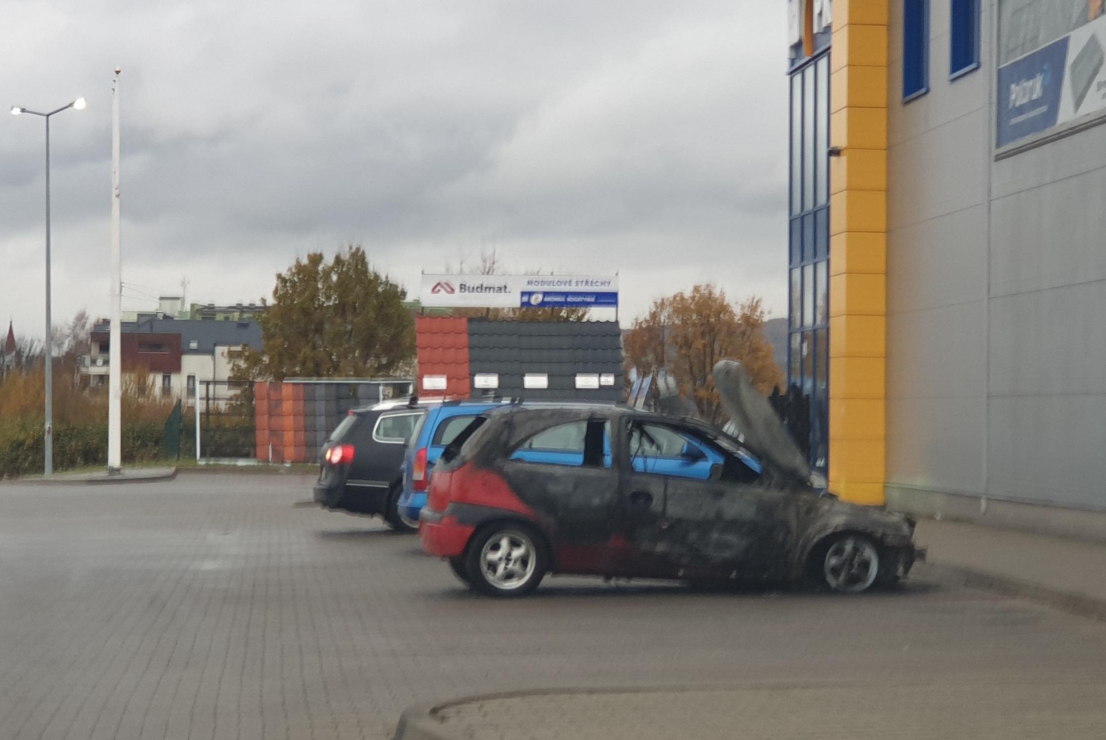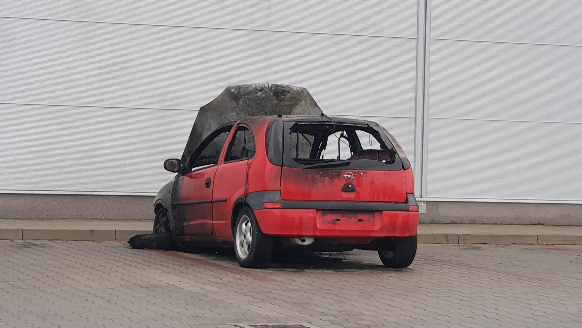 Opel spłonął pod marketem budowlanym