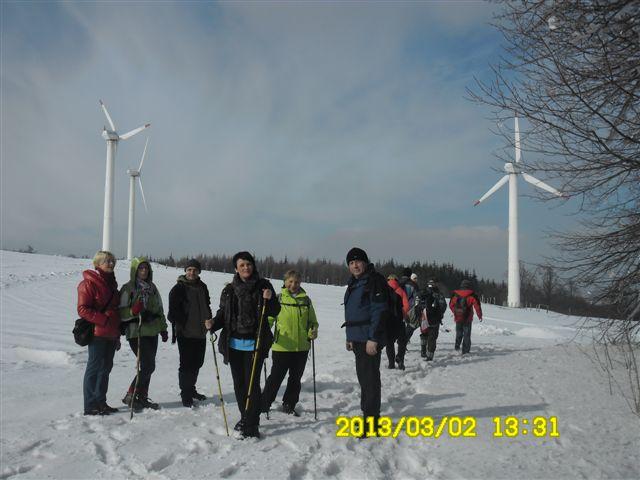 Po przejściu około 15 kilometrów zrobiliśmy sobie postój wykorzystując napotkane po drodze ławeczki. Piękne widoki i świecące słońce zachęcało do dalszej wędrówki więc wzmocnieni posiłkiem ruszyliśmy dalej. Po drodze widzieliśmy bunkry z drugiej wojny światowej, które zachowały się w dobrym stanie. Droga leśna powiodła nas do Albrechtic, a z stamtąd wspięliśmy się na Lysy Vrch (643 m.n.p) aby pokazać naszym znajomym znajdujące się tam wiatraki. Rozpościerające się z góry widoki zachwycały swym pięknem.