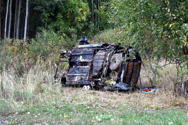Samochód stoi, a właściwie leży, w połowie Góry Działoszyńskiej niedaleko skrętu na tzw. zaporę. Nie wiadomo ile już czasu już tam spędził i jaka jest przyczyna, że się tam znalazł.
