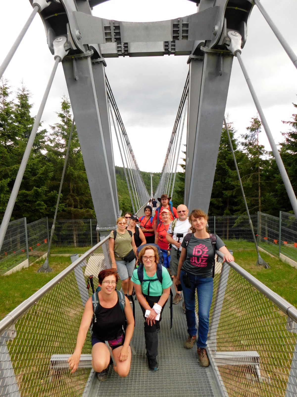 Następnie przejechaliśmy na czeską stronę, do Dolní Moravy, gdzie czekały na nas dwie atrakcje: słynna Ścieżka w Chmurach oraz Sky Bridge 721, najdłuższy wiszący most pieszy na świecie. Po jego przejściu rozpoczęliśmy wymagającą wędrówkę na Śnieżnik. Trasa była kamienista i pełna przewyższeń, co stanowiło niemałe wyzwanie dla uczestników.