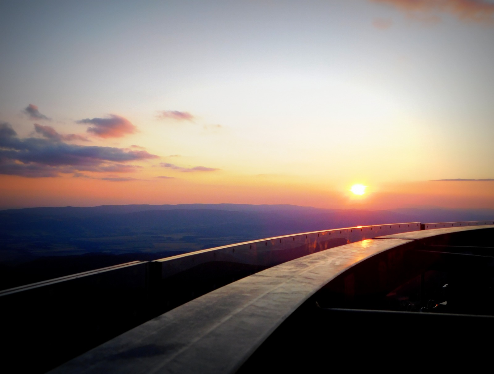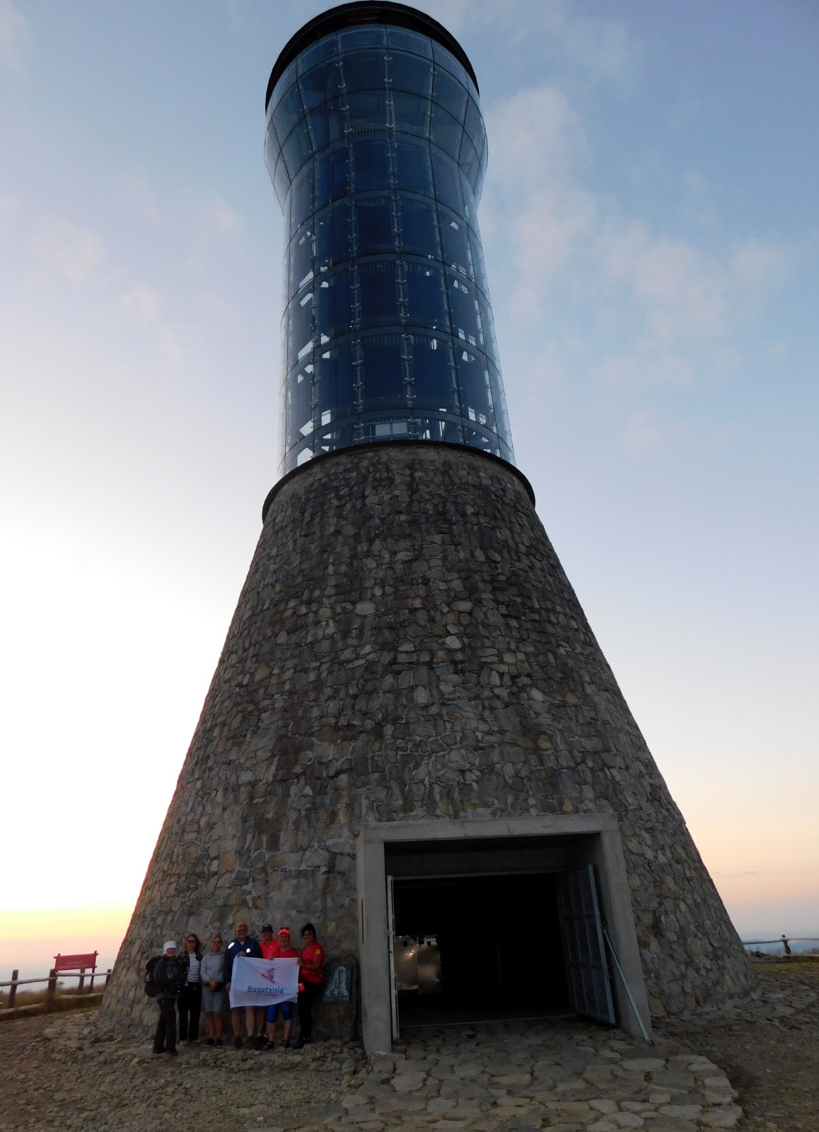 Na szczycie Śnieżnika odwiedziliśmy nową wieżę widokową, z której podziwialiśmy spektakularny zachód słońca. Dla wielu osób była to również okazja do zdobycia kolejnej pieczątki do Korony Gór Polski i innych górskich książeczek (niestety pieczątka zniknęła).