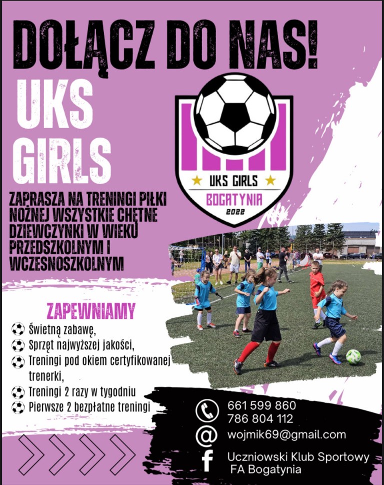 UKS Girls Bogatynia zaprasza wszystkie dziewczynki w wieku przedszkolnym i wczesnoszkolnym na treningi piłki nożnej. Klub powstał we wrześniu 2022 roku z myślą o dziewczynkach w wieku od 5 do 10 lat. To najlepszy wiek do kształtowania koordynacji oraz podstawowych umiejętności piłkarsko-ruchowych. Dzięki treningom w UKS Girls, dziewczynki idące do szkoły podstawowej posiadają już solidne podstawy do dalszego rozwoju psychoruchowego.