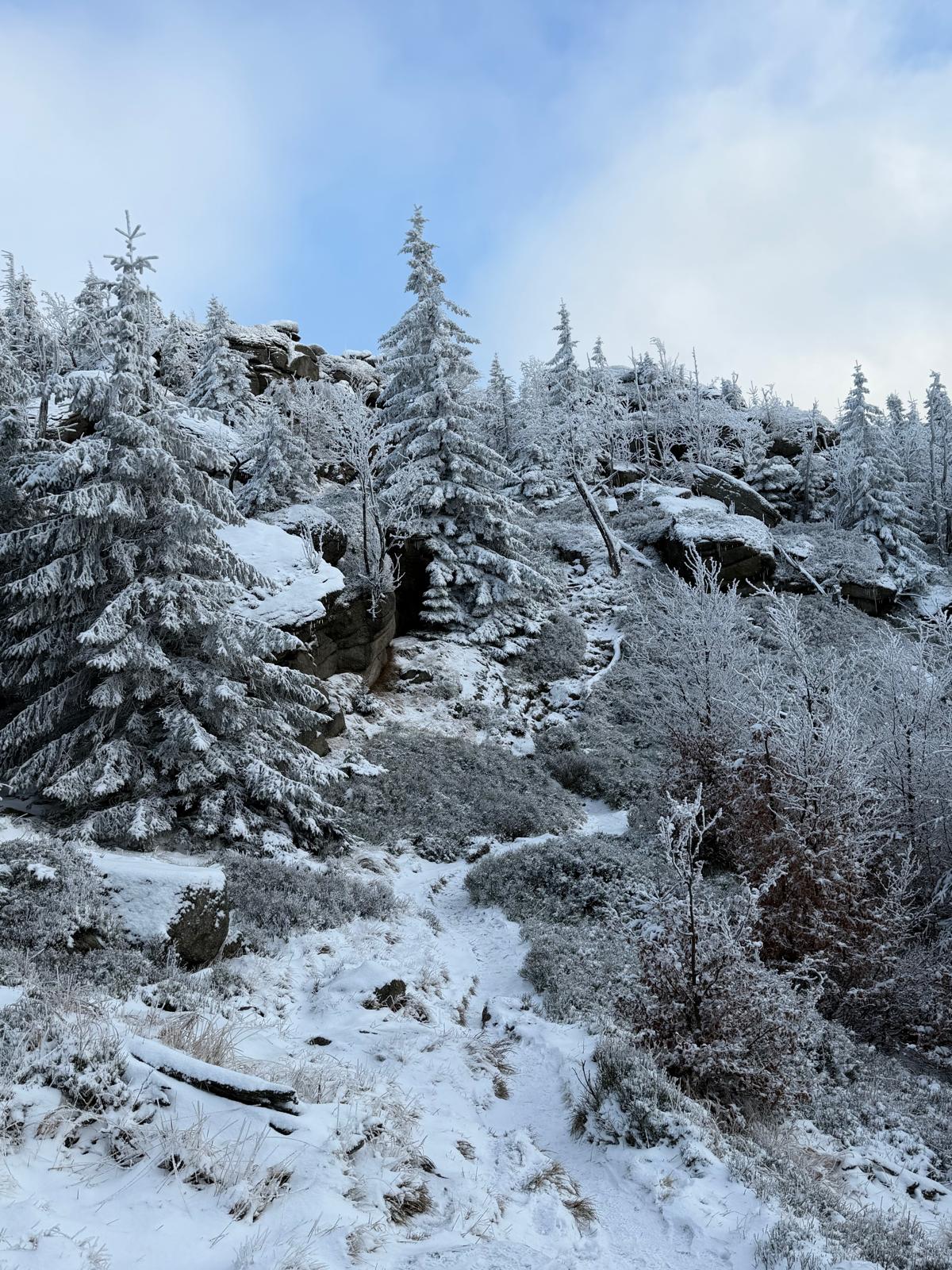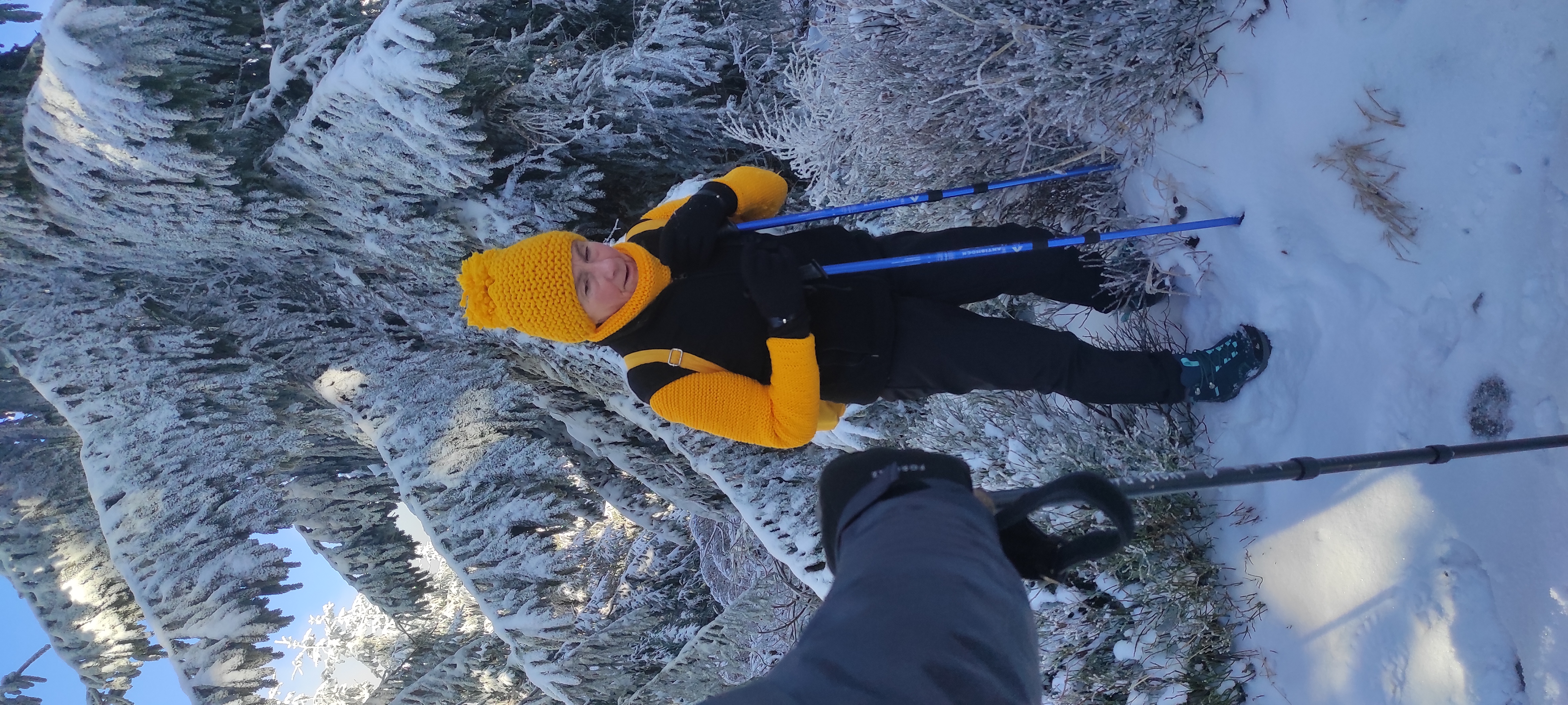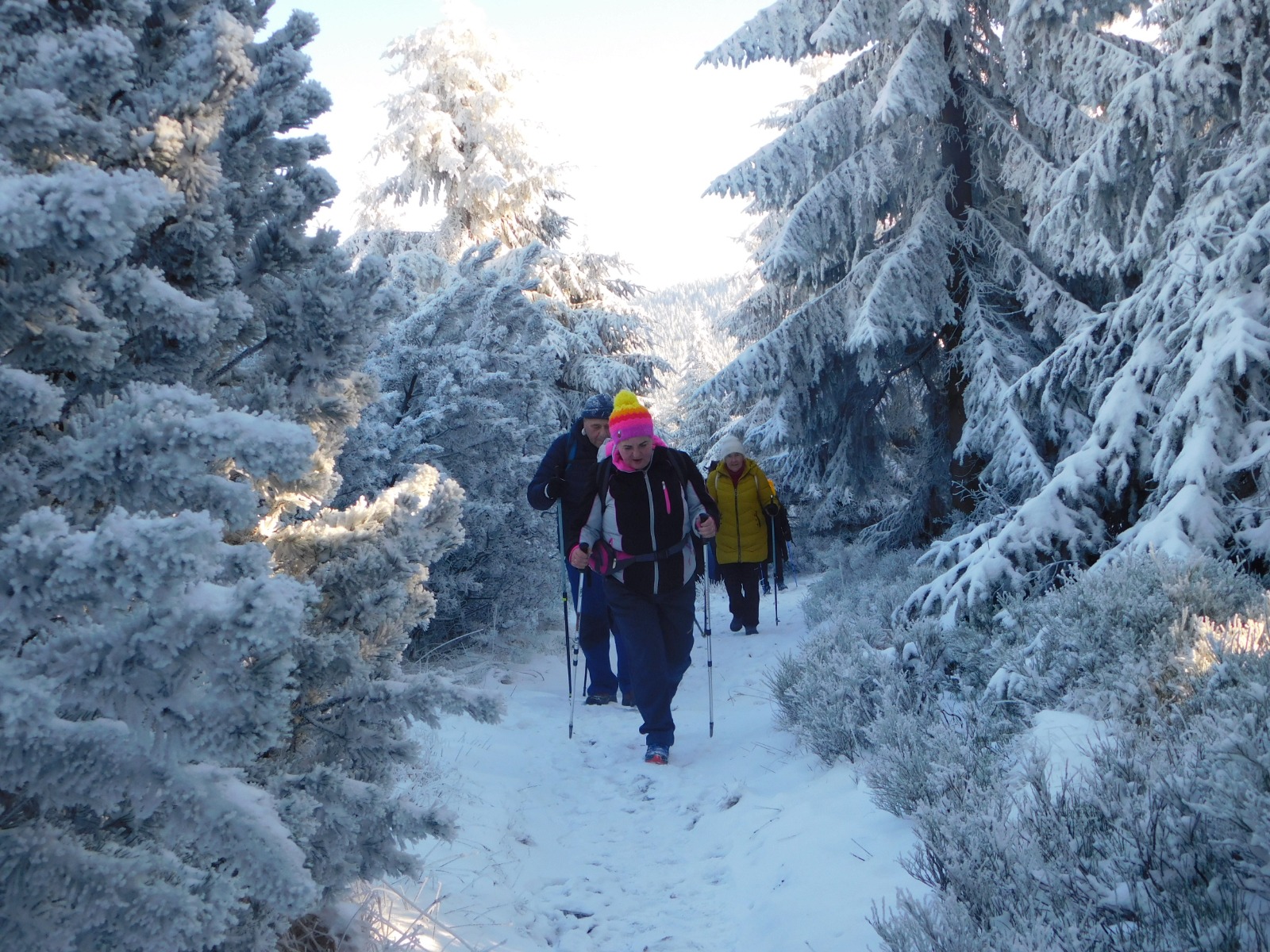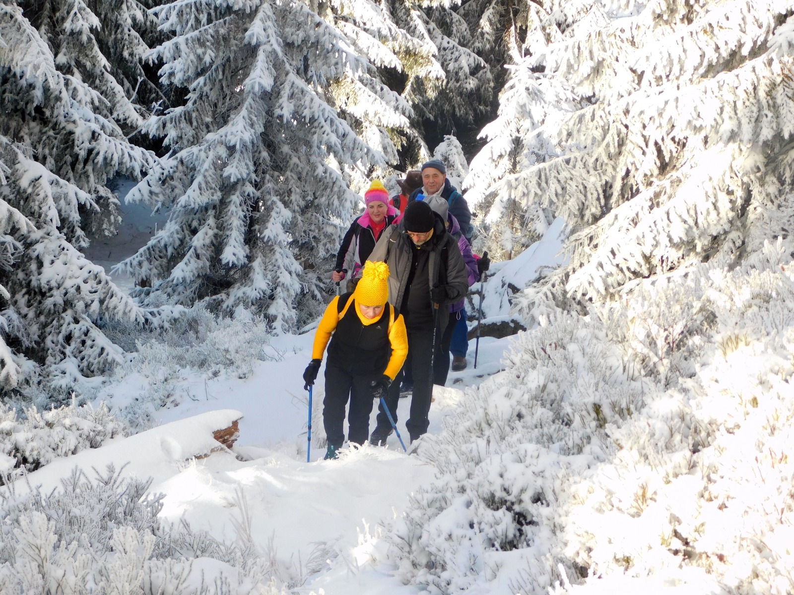 Nasza trasa rozpoczęła się od wejścia na Izery (1122 m n.p.m.), co w warunkach świeżego śniegu było nie lada wyczynem. Im wyżej podchodziliśmy, tym bardziej zmieniał się krajobraz. Jesienne barwy stopniowo ustępowały miejsca bieli i szronowi. Drzewa, niczym rzeźby, przystrojone były grubą warstwą szadzi, która w świetle dnia mieniła się jak kryształowe pióra. Każdy krok po miękkim, świeżym śniegu wydawał charakterystyczne chrupnięcie, tworząc zimową muzykę wędrówki.