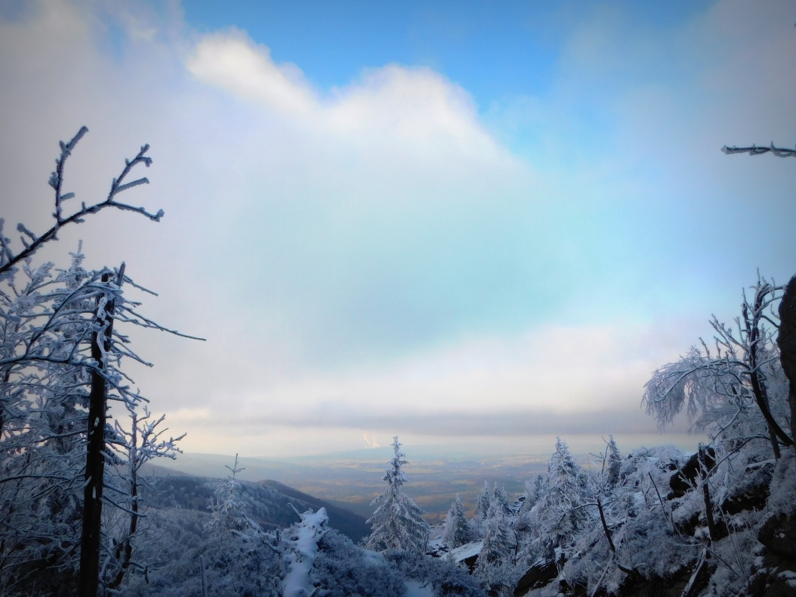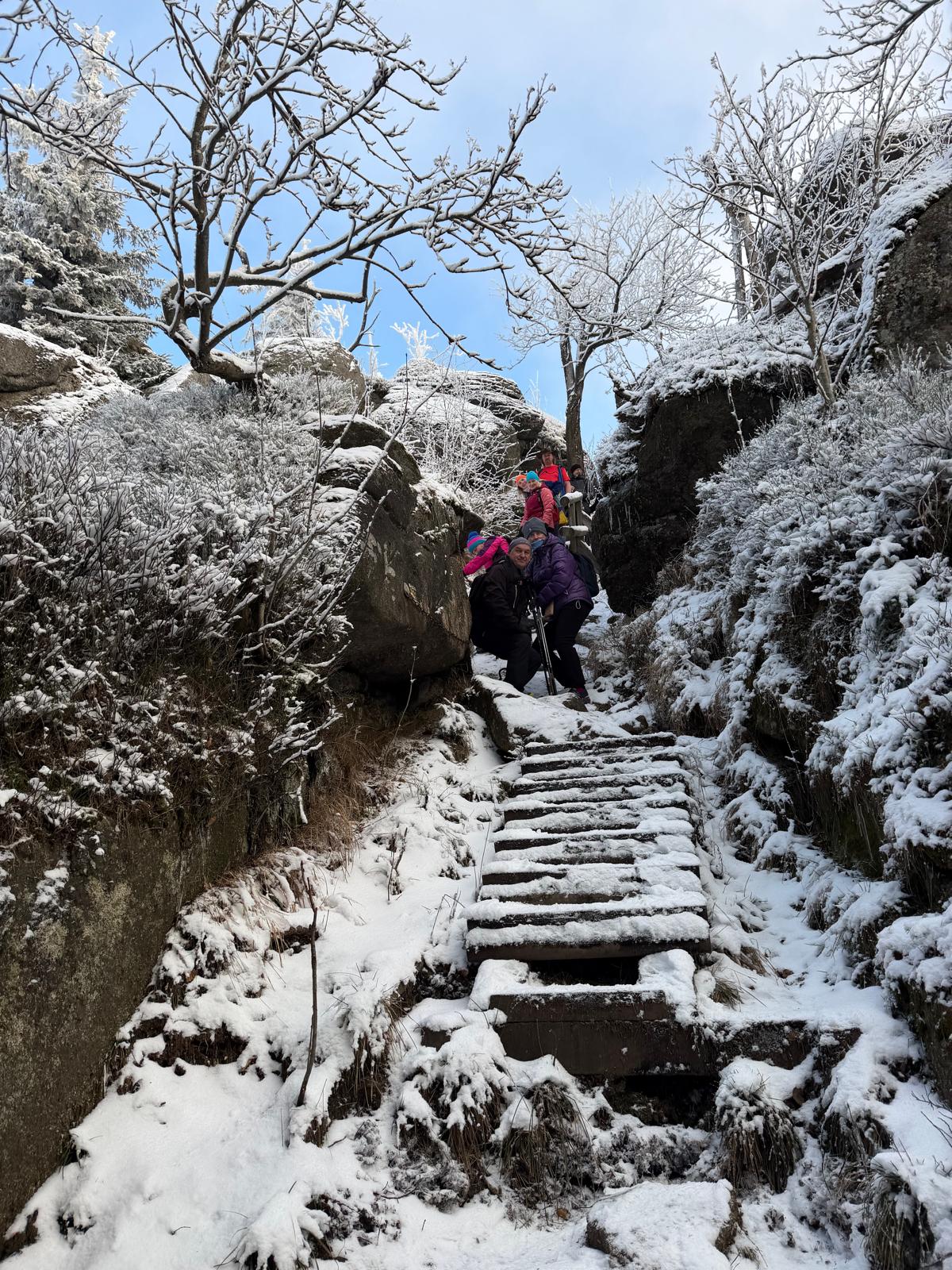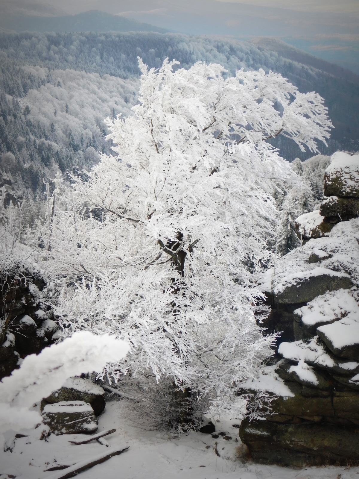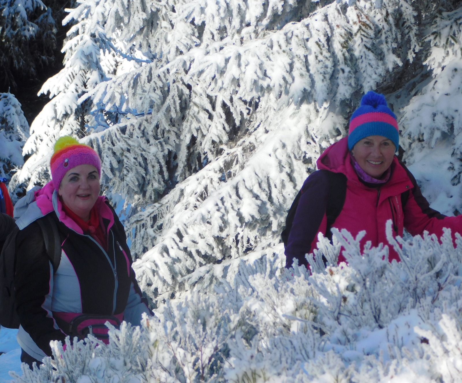Nasza trasa rozpoczęła się od wejścia na Izery (1122 m n.p.m.), co w warunkach świeżego śniegu było nie lada wyczynem. Im wyżej podchodziliśmy, tym bardziej zmieniał się krajobraz. Jesienne barwy stopniowo ustępowały miejsca bieli i szronowi. Drzewa, niczym rzeźby, przystrojone były grubą warstwą szadzi, która w świetle dnia mieniła się jak kryształowe pióra. Każdy krok po miękkim, świeżym śniegu wydawał charakterystyczne chrupnięcie, tworząc zimową muzykę wędrówki.