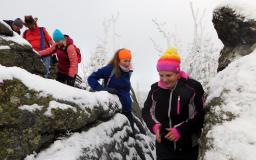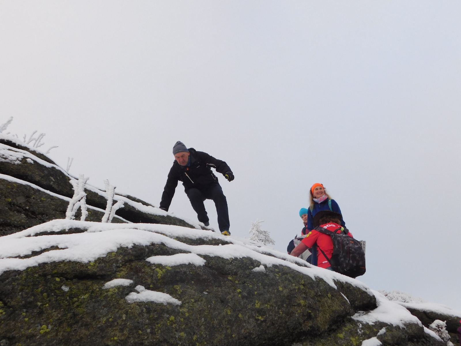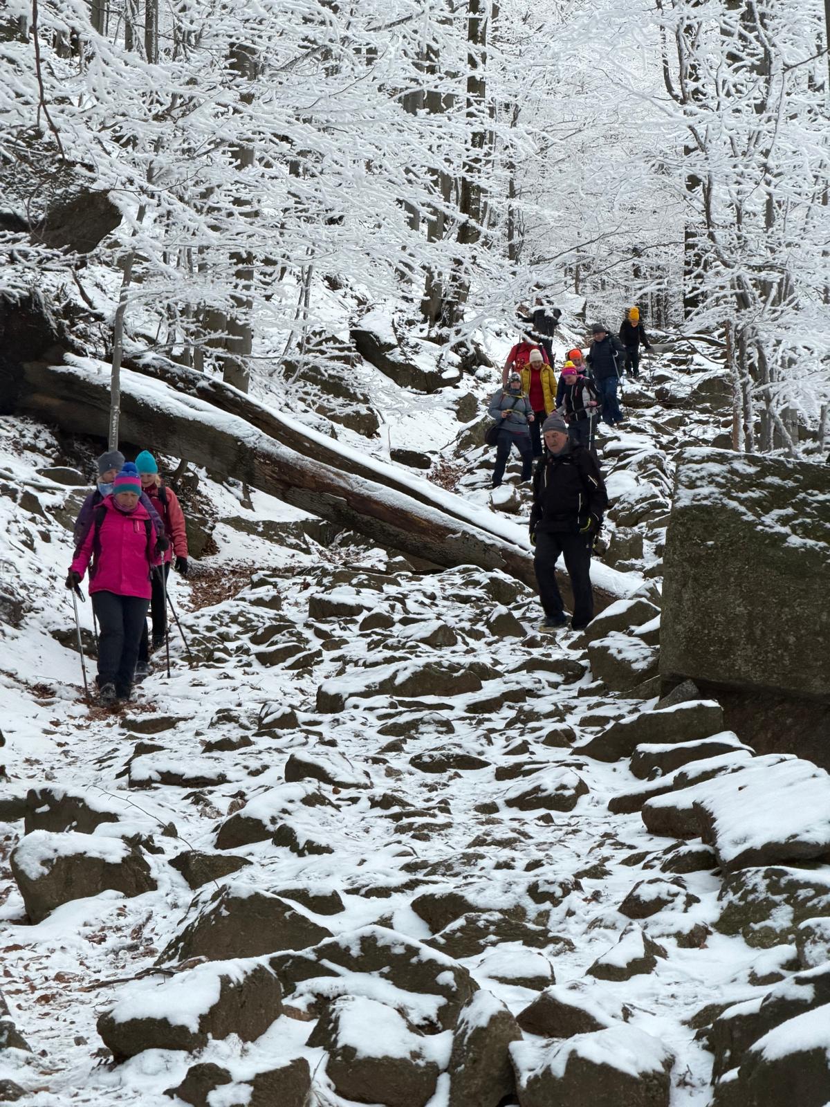 Po krótkim odpoczynku rozpoczęliśmy zejście, które w tej części Izerów nie należy do najłatwiejszych. Fragment wyposażony w klamry i łańcuchy w warunkach zimowych zamienia się w odcinek o podwyższonym stopniu trudności. Śliska skała pod cienką warstwą śniegu i lodu wymagała precyzji, pewnego chwytu i skupienia. Mimo trudnych warunków wszyscy uczestnicy przeszli ten fragment z rozwagą i świetną kondycją. Dla wielu był to jeden z najbardziej emocjonujących momentów tej wyprawy – prawdziwa górska przygoda, której nie zapomina się szybko.