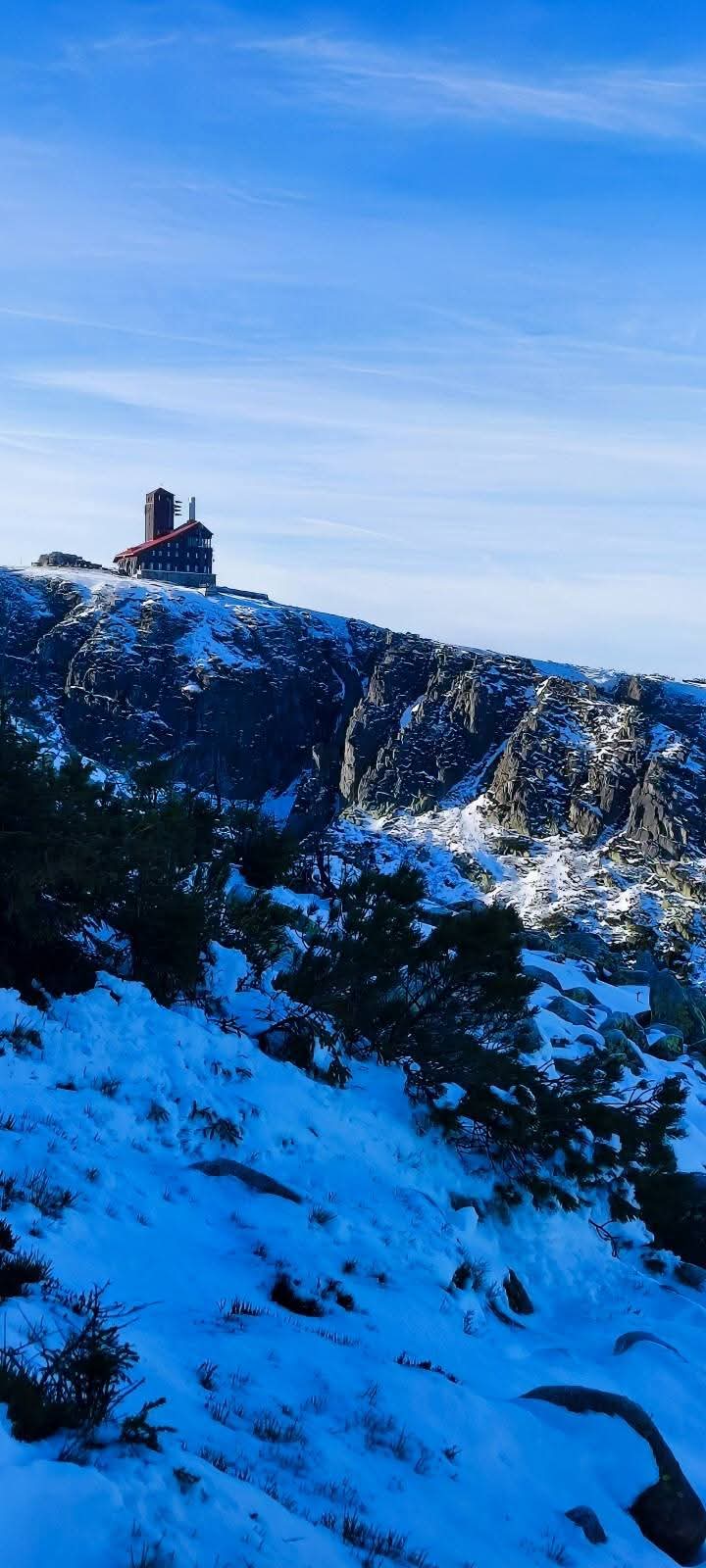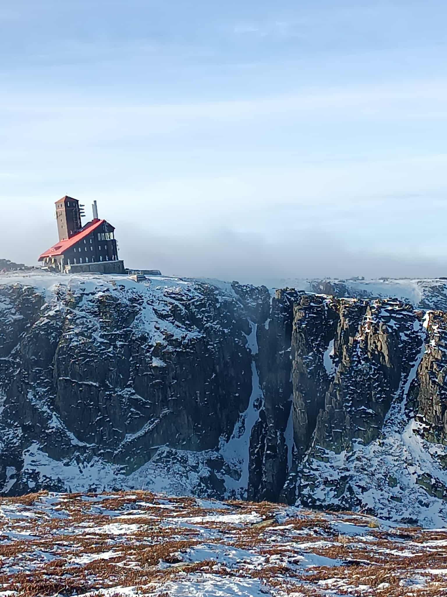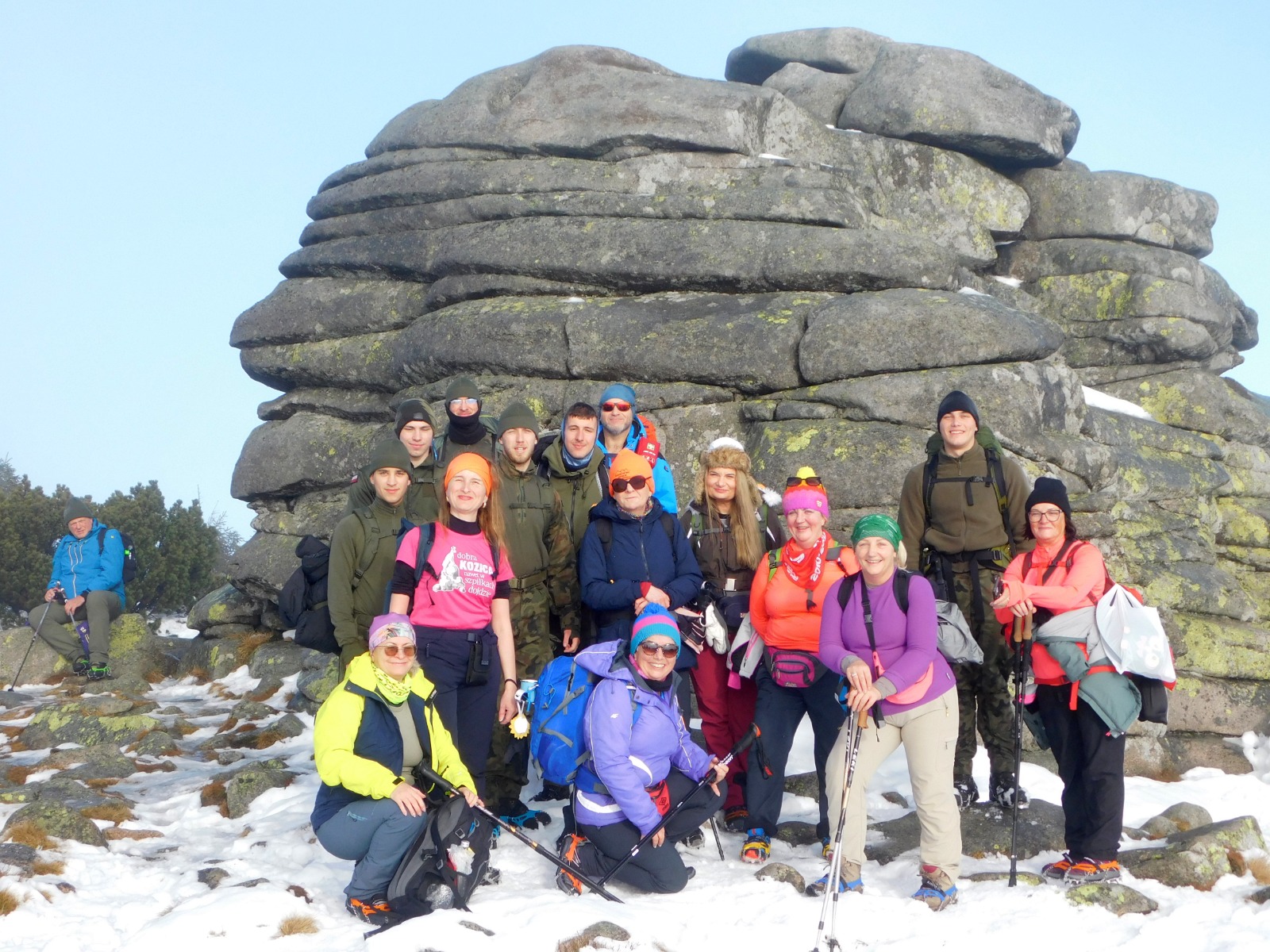 Niedzielny poranek powitał nas najpierw mgłą, a później piękną słoneczną pogodą i prawdziwie zimowym krajobrazem Karkonoszy. Po śniadaniu ruszyliśmy czerwonym szlakiem – Głównym Szlakiem Sudeckim, prowadzącym malowniczym grzbietem gór. Wspaniałe panoramy towarzyszyły nam przez całą drogę. Szczególne wrażenie zrobiły Śnieżne Kotły – monumentalne, polodowcowe ściany w zimowej szacie, które przypominały prawdziwą górską katedrę. Dalej przeszliśmy trasą zimową do Schroniska pod Łabskim Szczytem, skąd rozpoczęliśmy zejście do Szklarskiej Poręby. Śnieg, słońce i widoki sprawiły, że wędrówka była czystą przyjemnością.