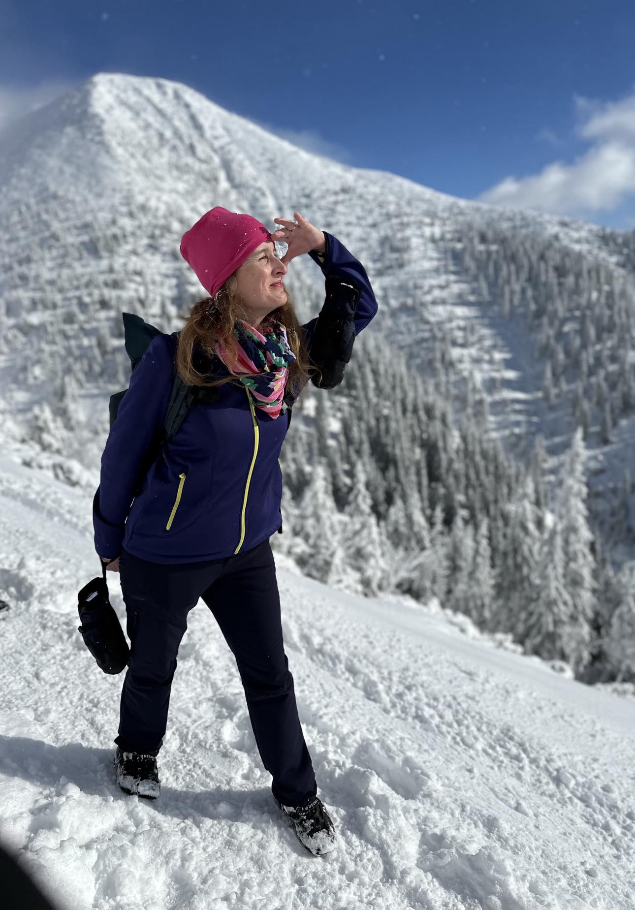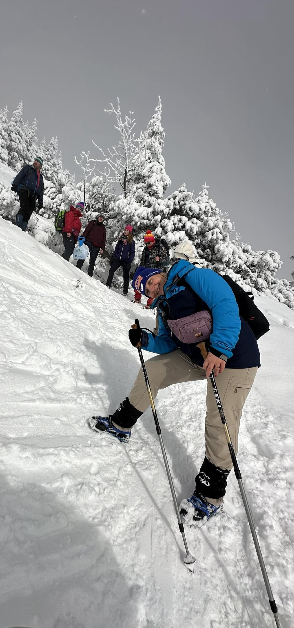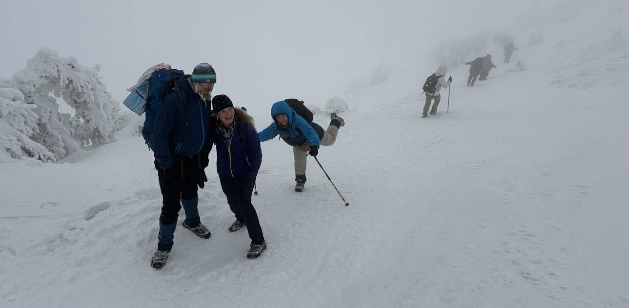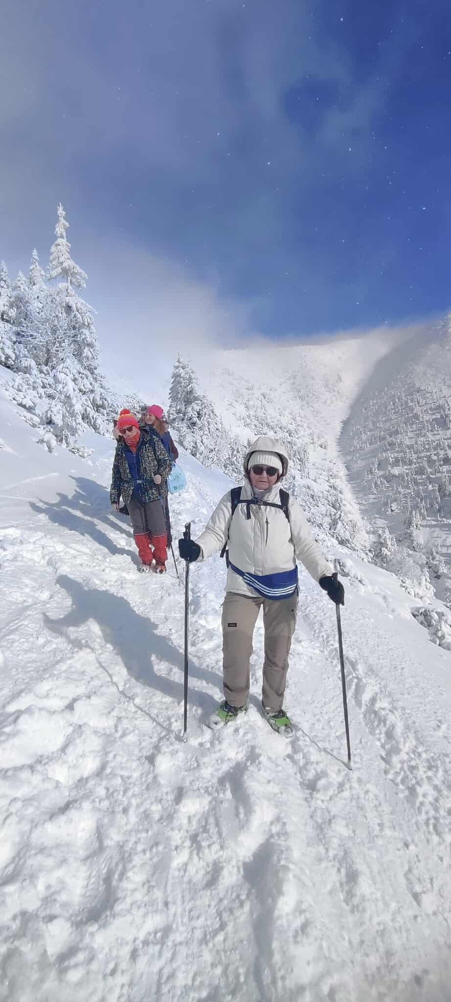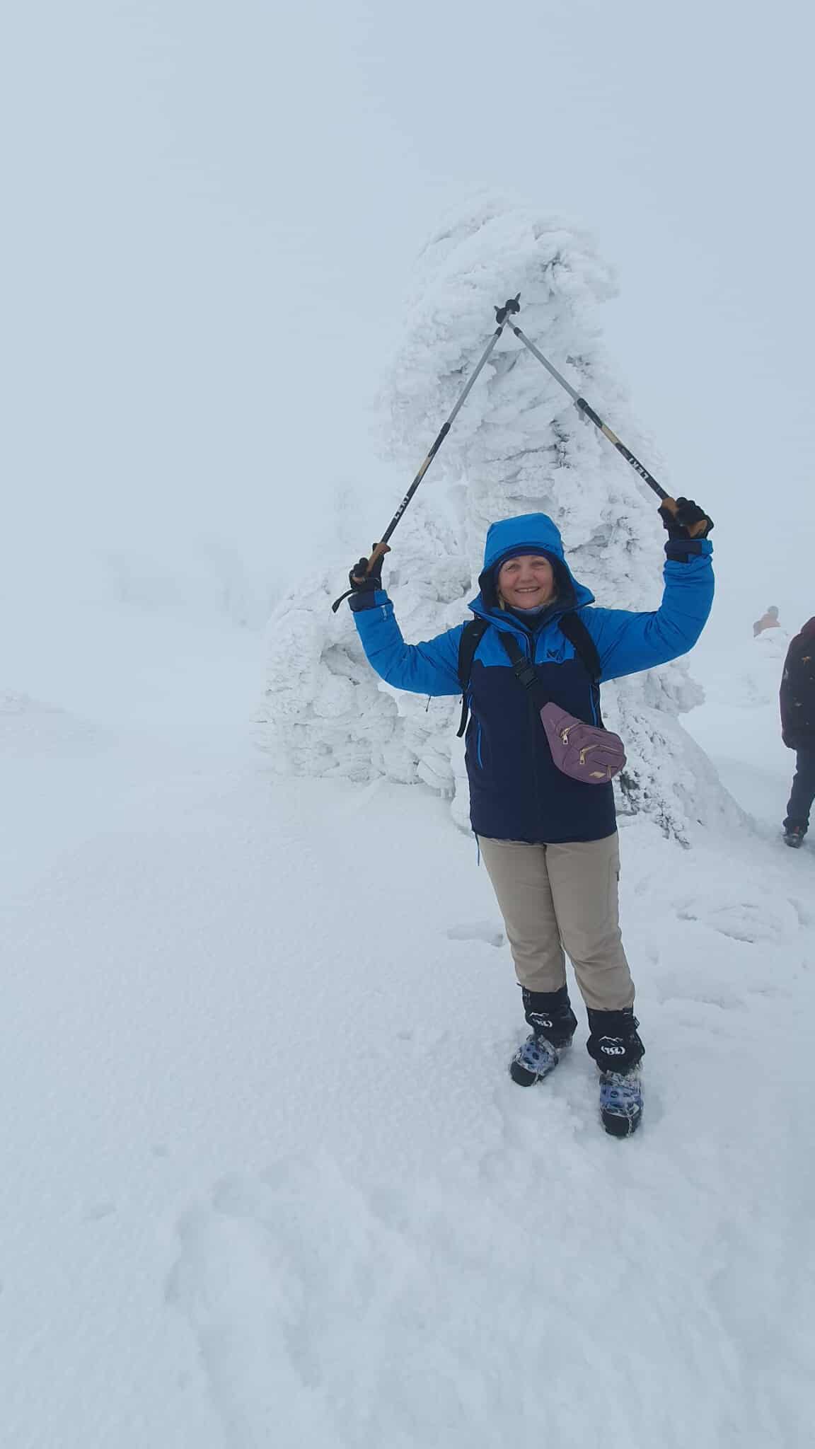 Początkowo warunki były wymagające – niska temperatura i silny wiatr potęgowały uczucie chłodu, a zmrożony śnieg na trawersach wymagał ostrożności i koncentracji. W niektórych miejscach oblodzona ścieżka i strome zbocza podnosiły poziom adrenaliny, przypominając o potędze i nieprzewidywalności gór. Z czasem jednak pogoda wynagrodziła nasze wysiłki. Pojawiło się tak zwane „okienko pogodowe” – wiatr ucichł, a zza chmur zaczęło przebijać się słońce. Oświetlone jego promieniami drzewa i krzewy pokryte lodem wyglądały jak kryształowe rzeźby. Każdy widział w nich coś innego: fantastyczne postacie, zwierzęta czy bajkowe kształty. Był to moment, w którym góry pokazały swoją najbardziej magiczną, niemal nierealną stronę.