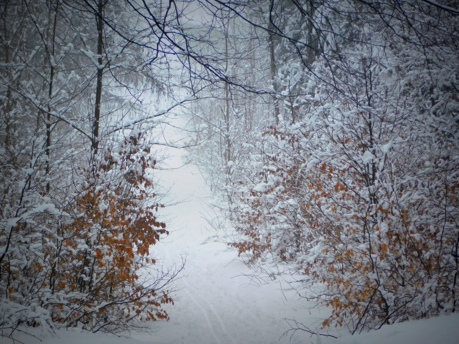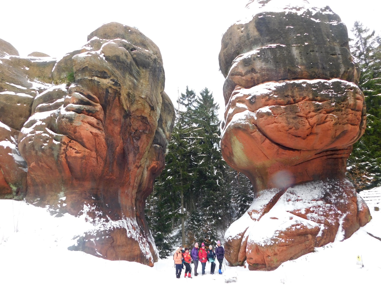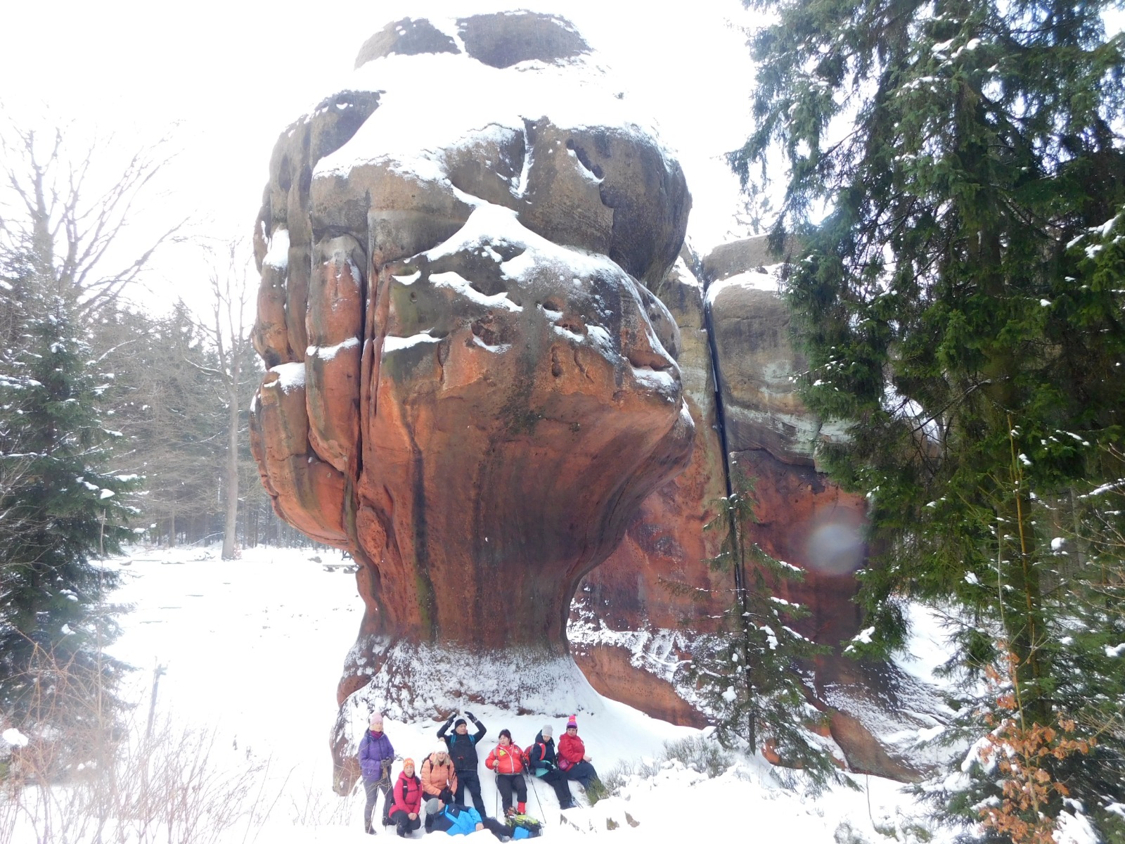 W drodze powrotnej w kierunku Oybin śnieg nadal padał jak delikatny puch gęsi, nadając wędrówce niemal bajkowy charakter. To właśnie na tym odcinku mijaliśmy charakterystyczne formy skalne zwane „grzybkami” lub „kielichami”. Ich czerwonawy kolor skały pięknie kontrastował z bielą świeżego śniegu, a fantazyjne kształty przypominały ogromne kamienne kapelusze wyrastające z ziemi. Pokryte śniegiem wyglądały wyjątkowo malowniczo i stanowiły jedną z największych atrakcji tej trasy.
