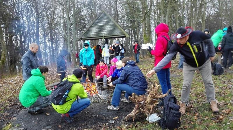 Z Wałbrzycha udaliśmy się do Boguszowa Gorce, gdzie znajduje się najwyżej położony rynek w Polsce 591 m n.p.m., a także góra Chełmiec 851 m n.p.m. leżąca w paśmie Gór Wałbrzyskich, którą zdobywamy do Korony Gór Polskich. Cały czas mieliśmy piękną pogodę i humory nam dopisywały, po drodze dołączyła do nas grupa z Boguszowa i dalej razem dreptaliśmy na szczyt oddalony od miasta około 6 km. Nad wierzchołkiem góry, zaczęły pojawiać się czarne chmury i im wyżej wchodziliśmy tym szybciej zmieniała się pogoda. Najpierw pojawił się deszcz a później śnieg, który pobielił cały szczyt a nam i tak dopisywały humory. Odpaliliśmy ognisko na którym upiekliśmy kiełbaski a potem obejrzeliśmy wieże widokową (niestety tylko z zewnątrz bo była zamknięta) z 1888 roku, która jest najwyżej położonym punktem wznoszącym się ponad Górami Wałbrzyskimi i ma wysokość 869 m n. p. m. Na Chełmcu znajduje się też stalowy Krzyż Milenijny do którego prowadzi z Boguszowa Droga Krzyżowa Trudu Górniczego i my tym szlakiem szliśmy. Zaczęło się ściemniać więc zeszliśmy z góry i zielonym szlakiem dotarliśmy do naszego autobusu, którym wróciliśmy do Bogatyni.