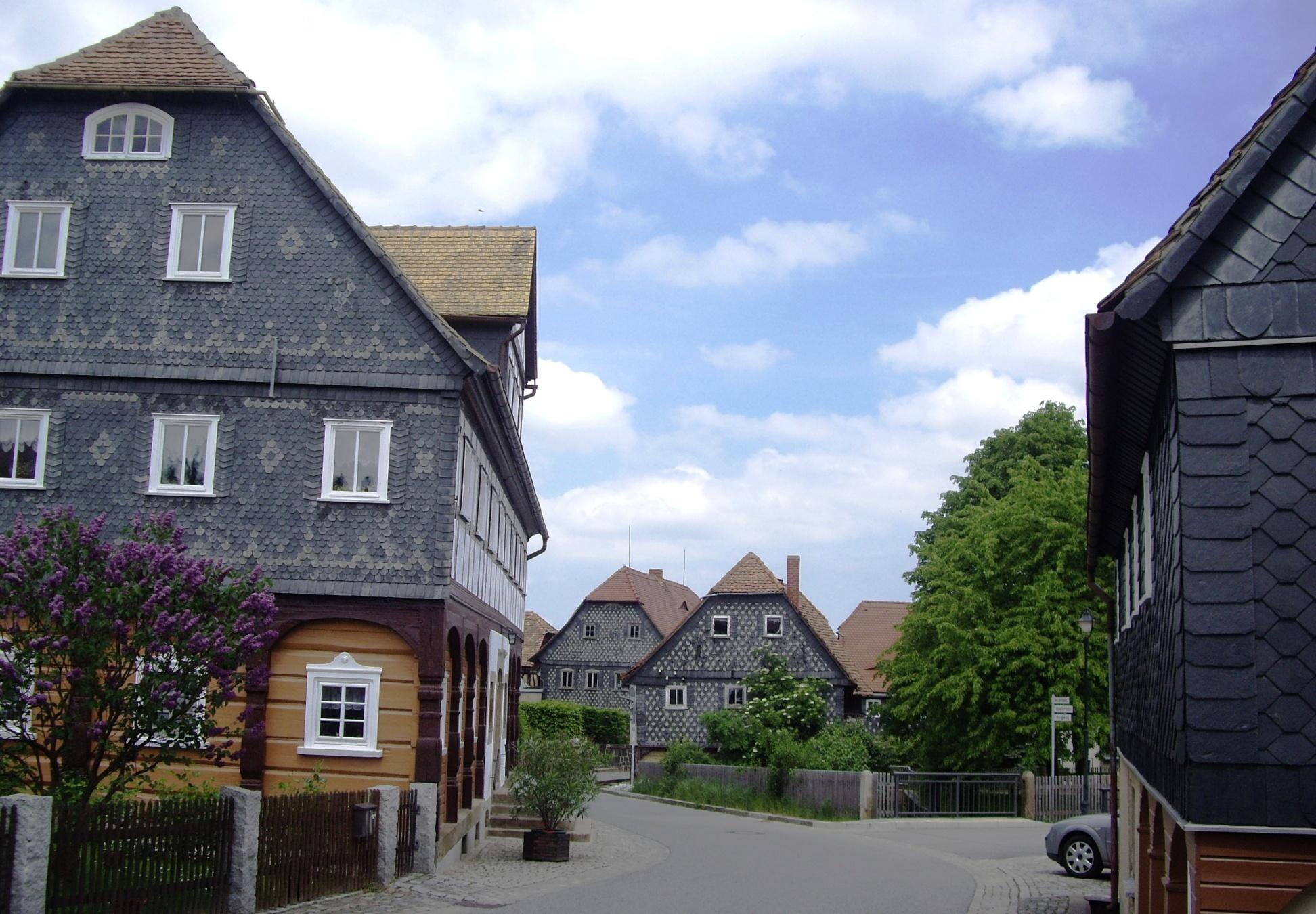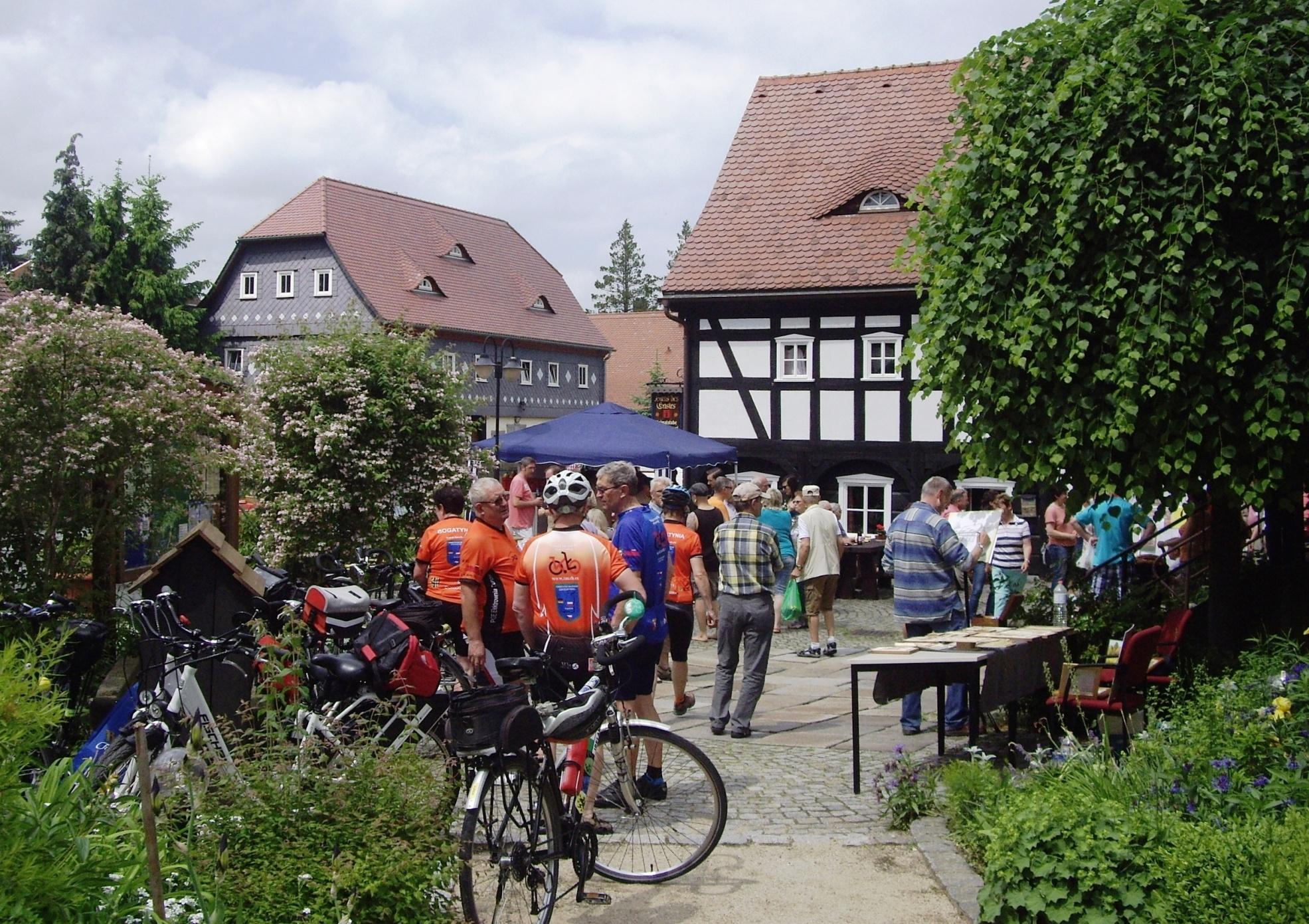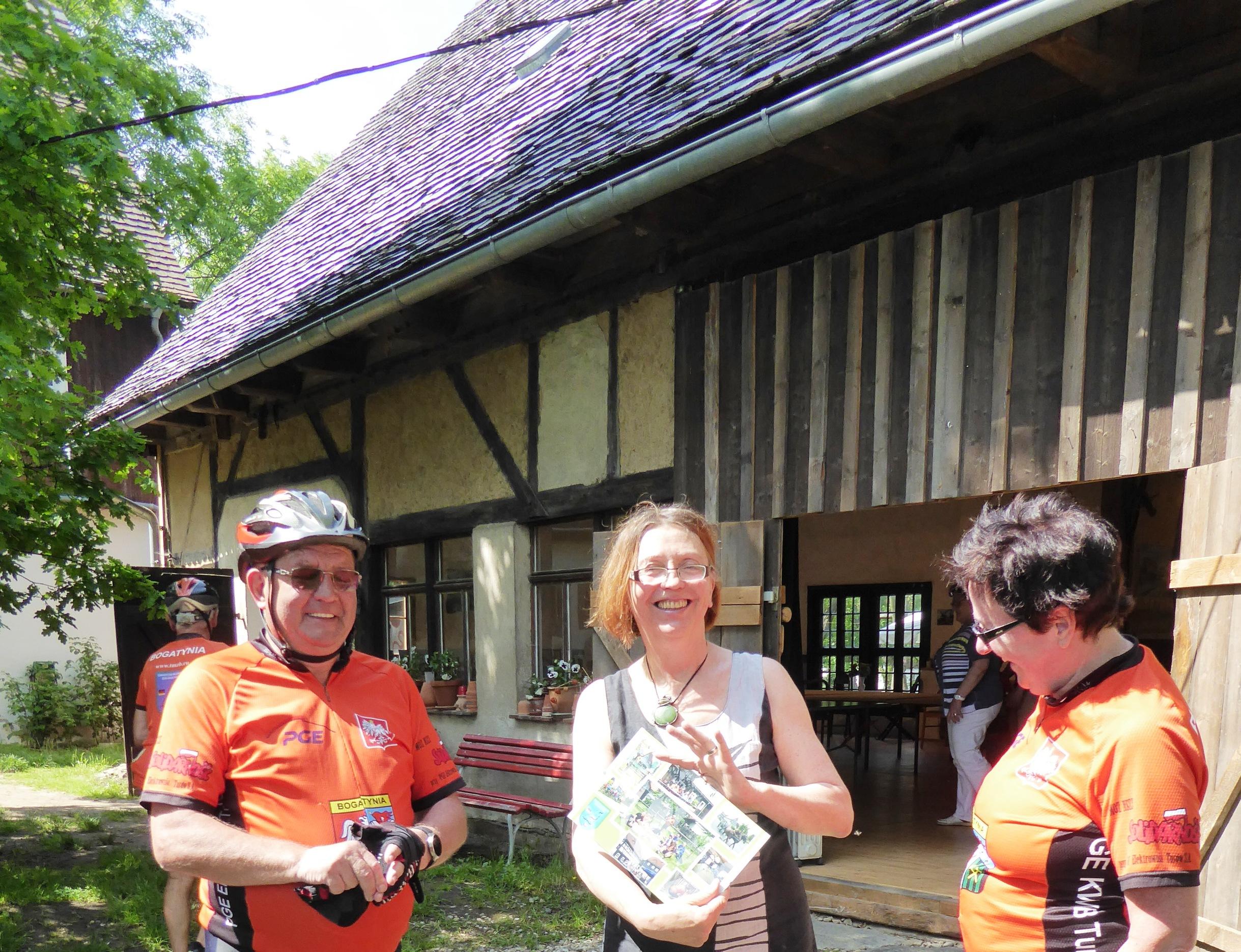 Tradycją i warunkiem otwarcia domów „z duszą” jest to że do środka, odwiedzających zaprasza gospodarz. To dumny właściciel opowiada o życiu, historii oraz dzisiejszych problemach i radościach związanych z mieszkaniem w domu przysłupowym, w otoczeniu kwiatów z zielonym ogródkiem. W tym jedynym dniu w roku, otwartym domom towarzyszą różne okoliczne imprezy, festyny i jarmarki, jednak najważniejszy jest dom jego charakter, przeznaczenie i stan („zdrowia”) zabytku. O tym dniu informują również plakaty z programem rozwieszone na okolicznych słupach, jednakowe dla całych Górnych Łużyc. Najbardziej przydatną informacją jest wskazanie otwartego domu, do którego można wejść do środka. Członkowie TMZB po raz kolejny wyruszyli na wycieczkę rowerową do Obercunnersdorf, by obserwować jak sąsiedzi radzą sobie z tym dniem. Czuliśmy się wyjątkowo zaglądając do środka zwykłego domu mieszkalnego, maleńkiego hoteliku, mini muzeum, biblioteki czy informacji turystycznej. Każdy dom inaczej zagospodarowany a jednak zadbany, z niepowtarzalną historią i różnymi pamiątkami. Każdy dom inny a w całości tworzą niepowtarzalny charakter małego miasteczka do, którego przyjeżdżają turyści z daleka by podziwiać. Obercunnersdorf to jedna z wielu miejscowości w krainie domów przysłupowych wpisana na listę pomników dziedzictwa kulturowego (około 250 domów przysłupowych). Pisaliśmy już o tym, ale nie szkodzi zobaczyć czy coś się zmieniło, a warto doczytać na stronach www.obercunnersdorf.de. Naszą grupę po raz kolejny gościła Dolores Weidner -Tille ze Stowarzyszenia Förderverein der Grenzregion „Obere Mandau/Spreequellen“. Ona sama z rodziną mieszka w domu przysłupowym a stodołę wykorzystują do organizacji różnych okazjonalnych spotkań i wystaw.